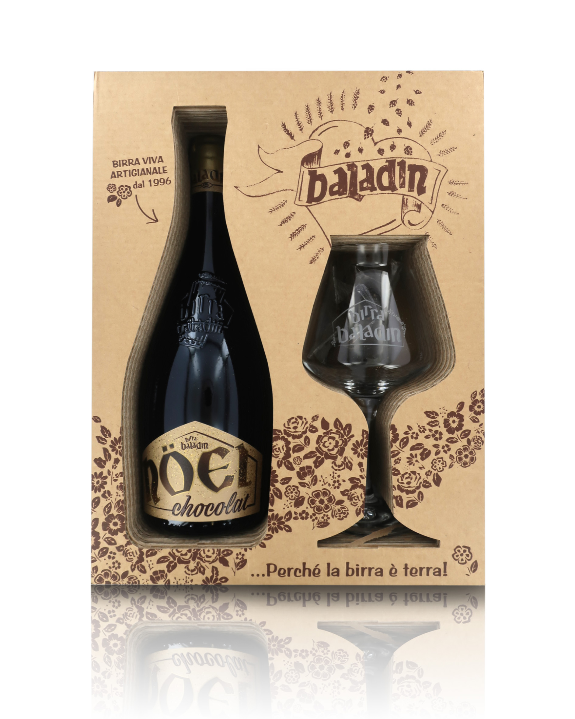 Una bellissima confezione regalo per un set dedicato agli amanti della bevanda al luppolo aromatizzata. La scatola sagomata include un bicchiere da degustazione brandizzato Baladin e una bottiglia di birra natalizia Nöel Chocolat (aromatizzata alle fave di cacao Criollo Chuao) da 75cl.
