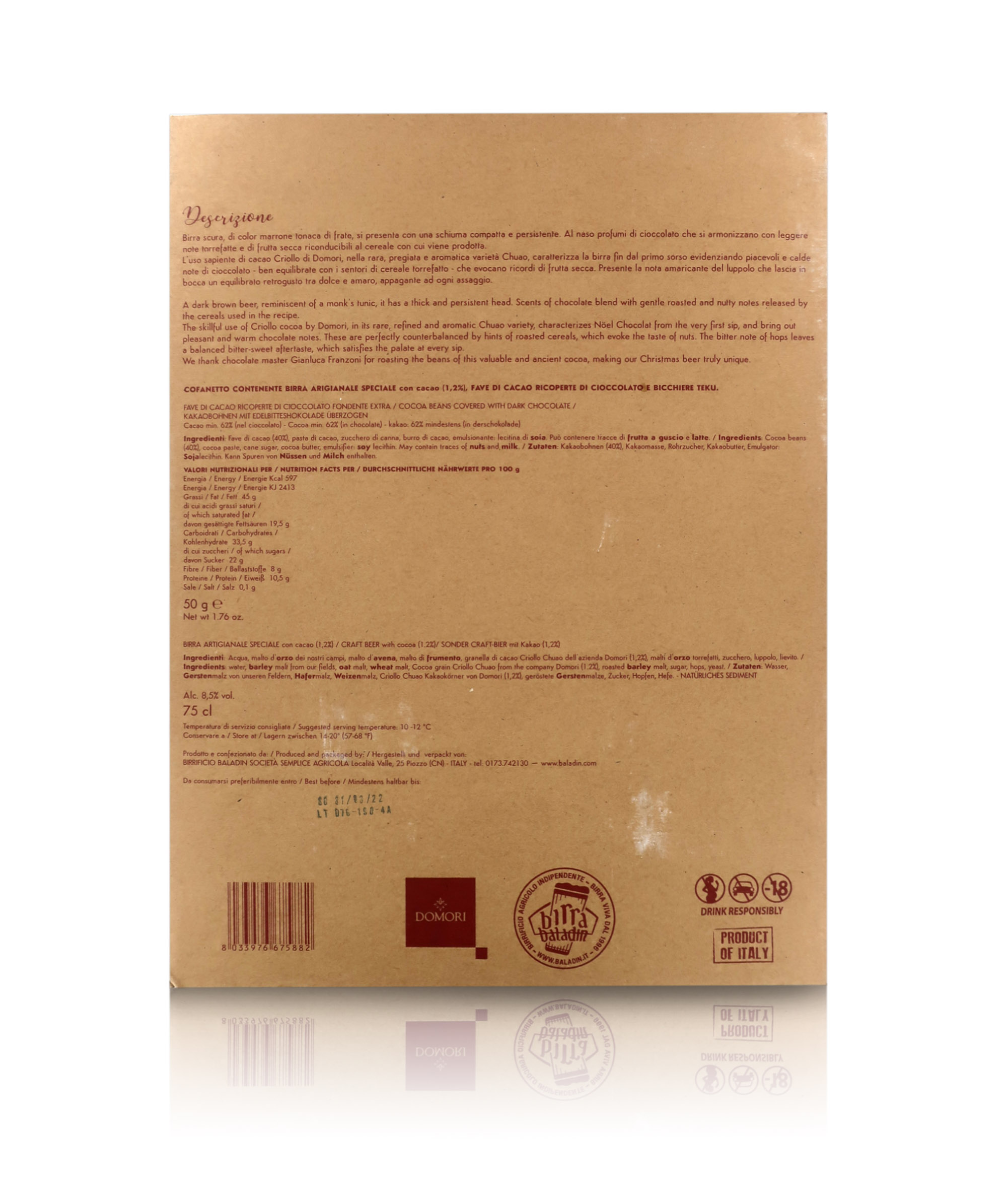 Ingredienti: acqua, malto d’orzo dei nostri campi, malto d’avena, malto di FRUMENTO, granella di Cacao Criollo Chuao dell’azienda Domori (1,2%), malti d’orzo torrefatti, zucchero, luppolo, lievito.