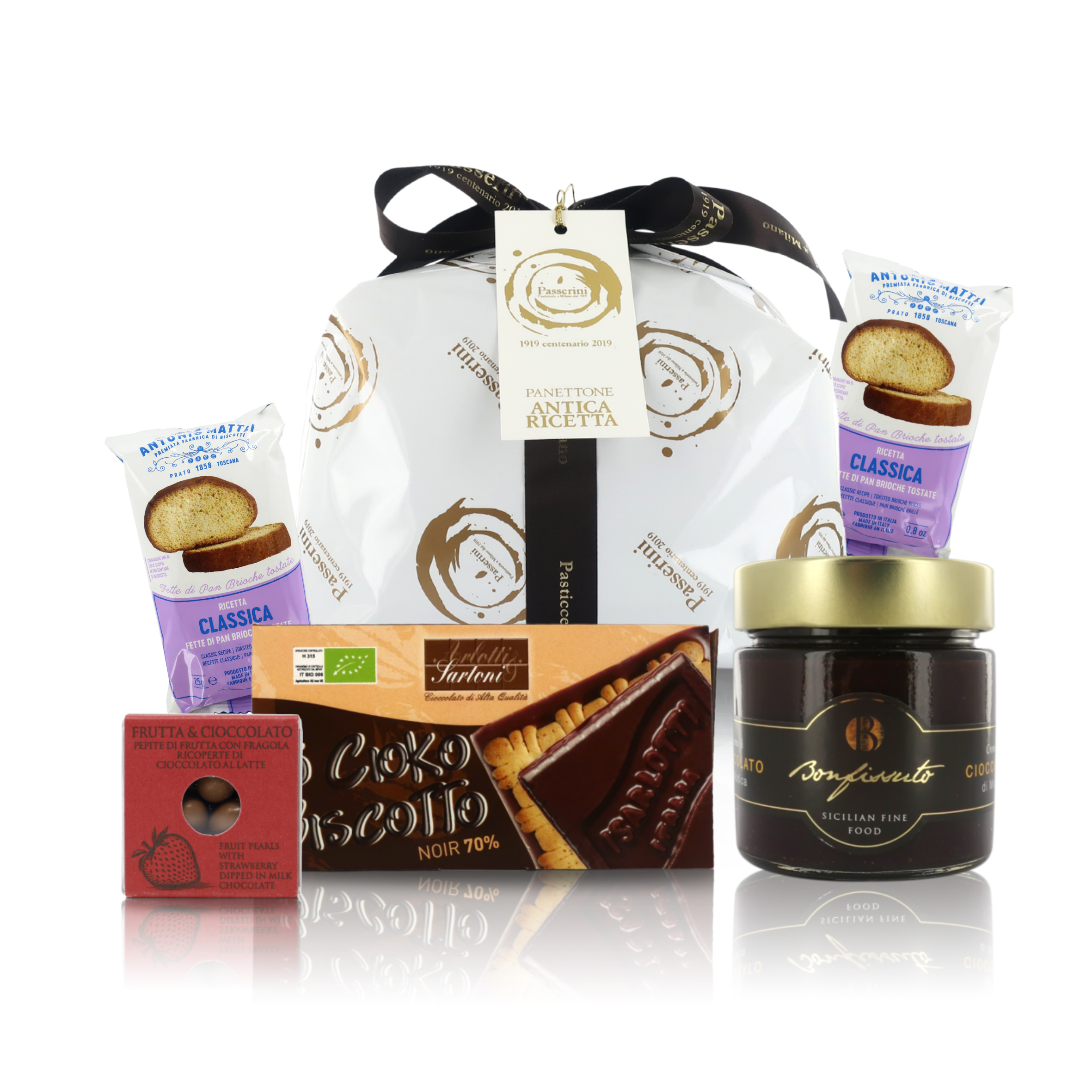 1 PANETTONE Passerini (1 kg); 1 vasetto di CREMA ARTIGIANALE AL CIOCCOLATO di Modica spalmabile Bonfissuto (180 g); 2 monoporzioni di BISCOTTI della Salute di Antonio Mattei [fette di pan brioche tostate (ogni monoporzione contiene 2 biscotti e pesa 25g)]; 1 confezione di DRAGÉES T'a Milano (pepite di fragola ricoperte di cioccolato al latte); 1 confezione di BISCOTTI secchi ricoperti di cioccolato fondente "Cioko" di Arlotti e Sartoni (100g).
