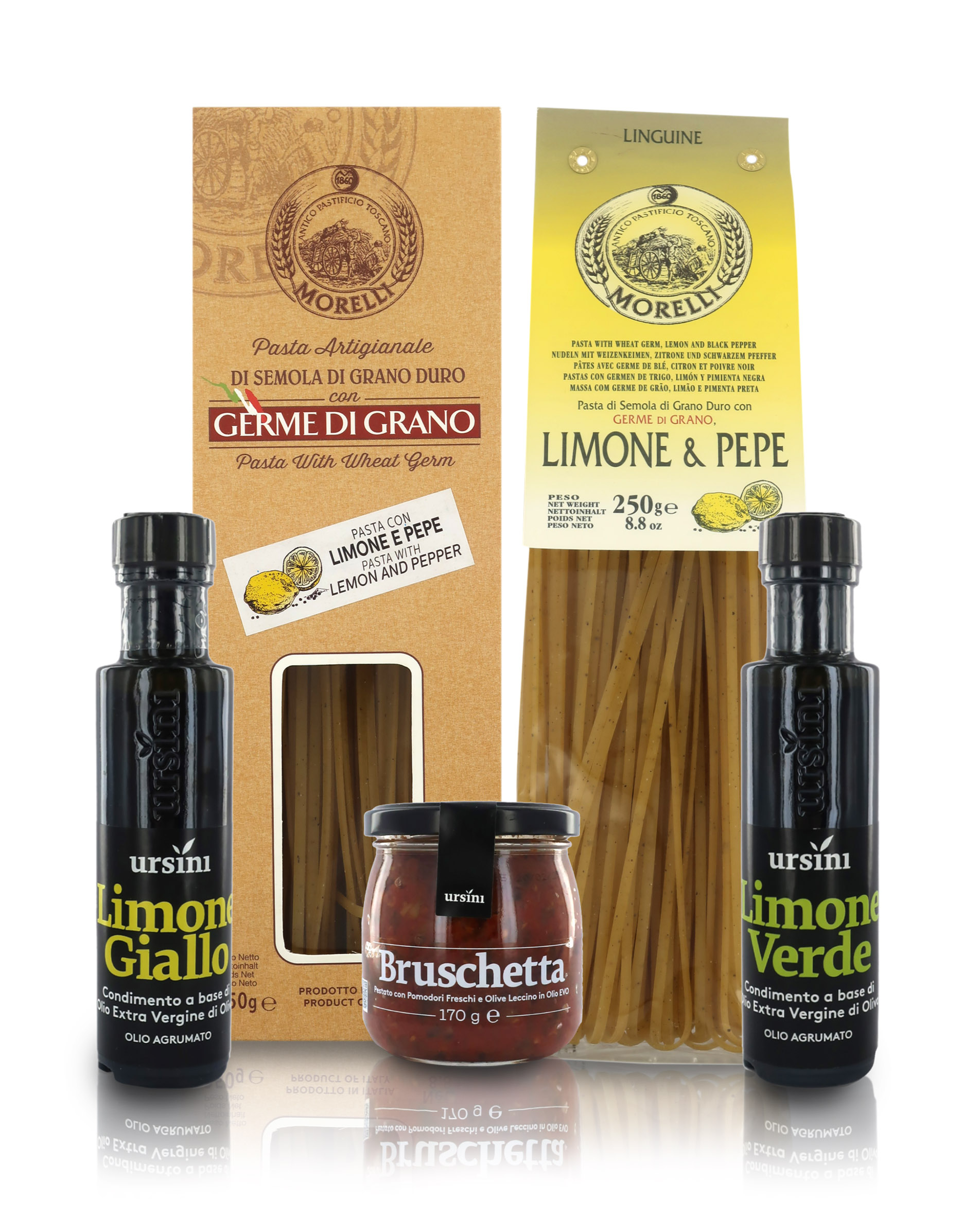 2 confezioni di PASTA Morelli al limone e pepe (250g per conf.); OLIO extra vergine d'oliva Ursini AROMATIZZATO al limone giallo (100 ml); OLIO e.v.o. Ursini AROMATIZZATO al limone verde (100g); PESTATO PER BRUSCHETTE - pâté di pomodoro e olive in olio extra vergine d'oliva Ursini (170 g).