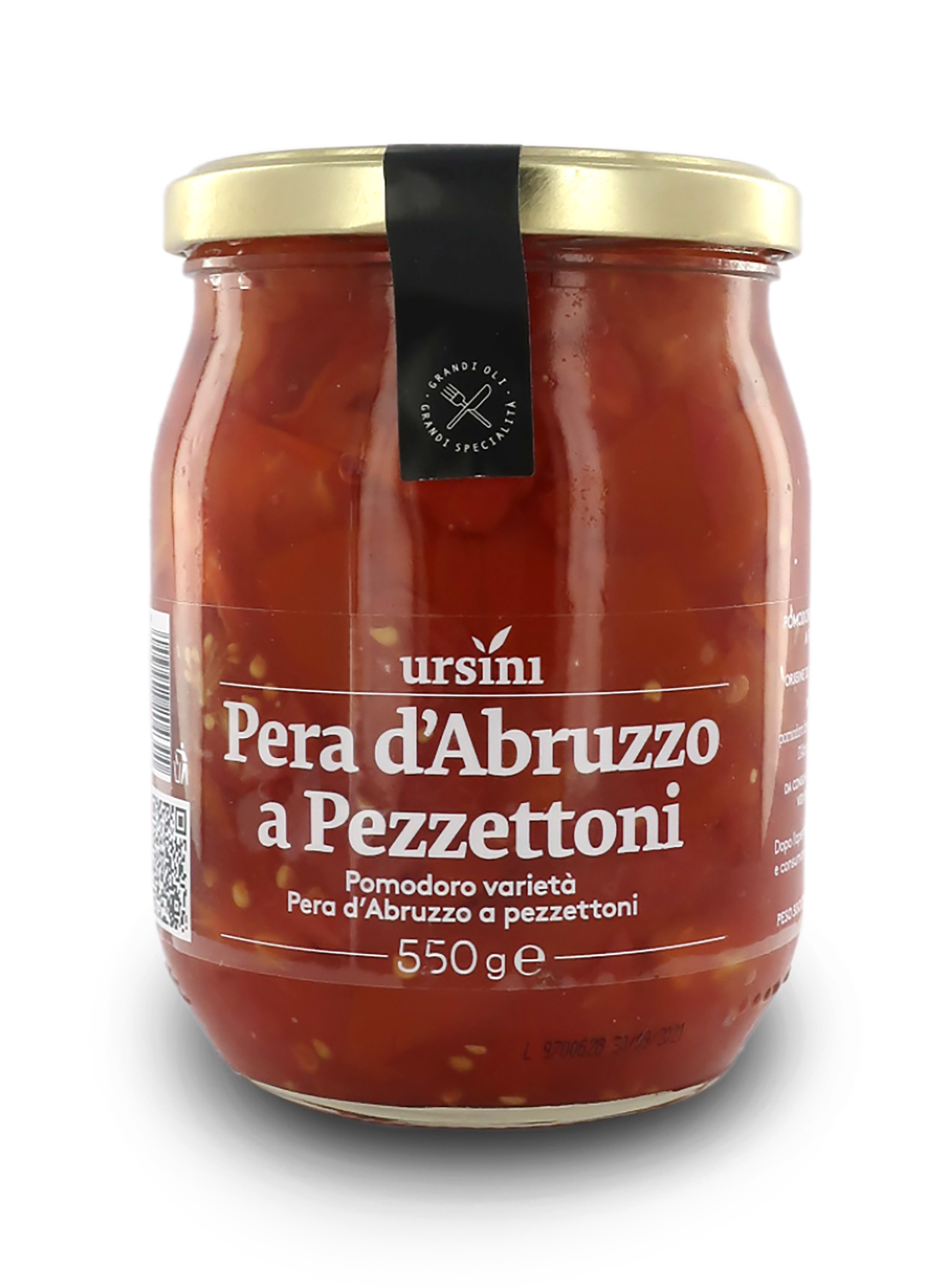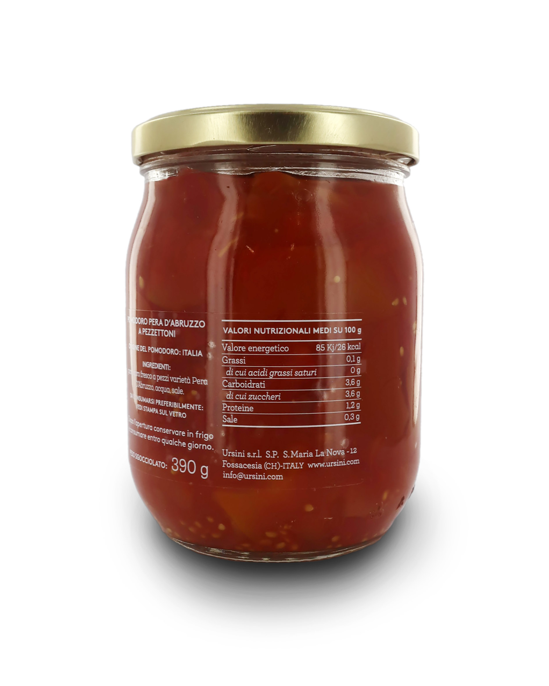 Vasetto di pomodori "Pera d'Abruzzo" a pezzettoni (peso netto: 550g / sgocciolato: 390g). Questo tipo di pomodoro è molto apprezzato per la sua dolcezza, per la scarsa presenza di semi e per l'abbondante polpa.