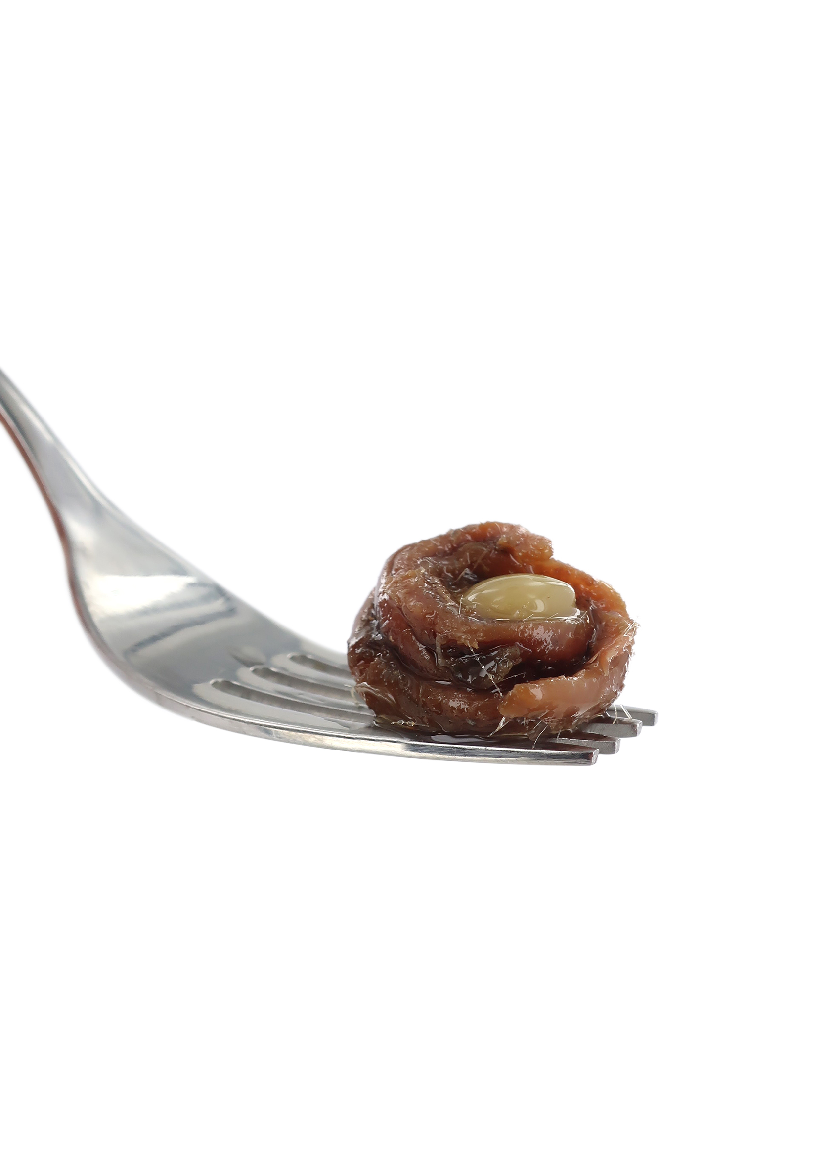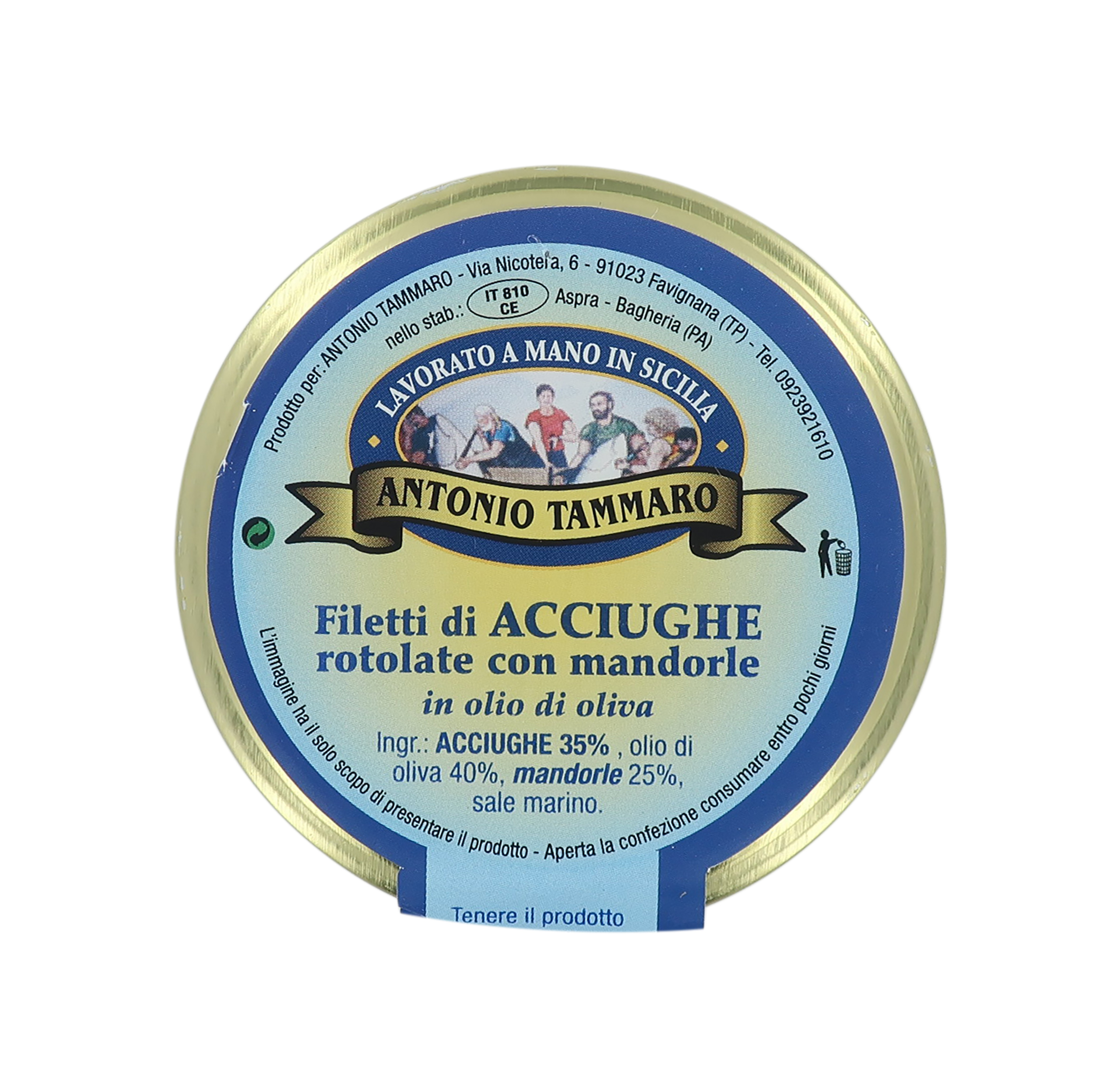 Acciughe arrotolate con mandorla al centro (vasetto di vetro da 200g). Queste saporite acciughe sono ottime per un aperitivo ricco di gusto e di sicilianità.