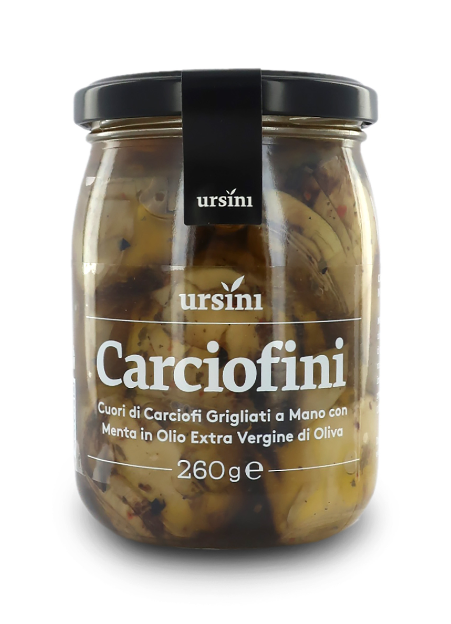 Cuori di carciofi italiani grigliati a mano e conservati in olio extra vergine d'oliva. Il loro gusto viene esaltato da spezie e dalla menta. I carciofi sono attentamente selezionati affinché non presentino spine né peluria, che possono risultare fastidiosi durante il loro consumo. La lavorazione dal fresco fa sì che il prodotto rimanga sodo durante tutto il periodo della conservazione. Ottimi come aperitivo, contorno o in insalate.