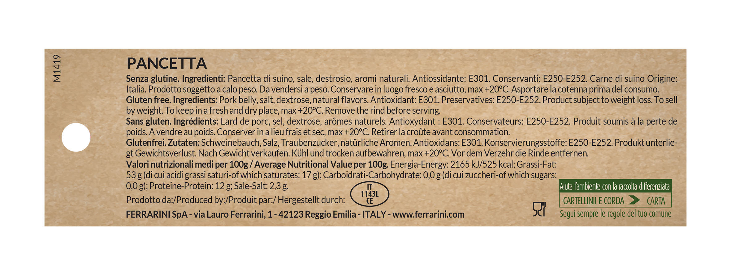 La Pancetta Steccata Ferrarini è un salume di qualità superiore, prodotto rigorosamente con carne italiana nel pieno rispetto delle antiche tradizioni della cucina della nostra penisola. La Pancetta Steccata Ferrarini è realizzata con carne di suino esclusivamente italiano e di altissima qualità, accuratamente selezionata da una Filiera Ferrarini 100% italiana. La Pancetta Steccata Ferrarini, che viene venduta in una doppia stecca di legno di abete, è un salume versatile, ideale per la preparazione di numerosi piatti della cucina italiana, come i primi piatti o i secondi a base di carne. Grazie alla sua qualità superiore e alla sua tipicità, la Pancetta Steccata Ferrarini è un'ottima scelta per chi cerca prodotti autentici. È particolarmente indicata per ristoranti, esercizi commerciali e negozi gastronomici tipici: farà sicuramente un figurone nel banco salumi di gastronomie o piccoli bistrot.