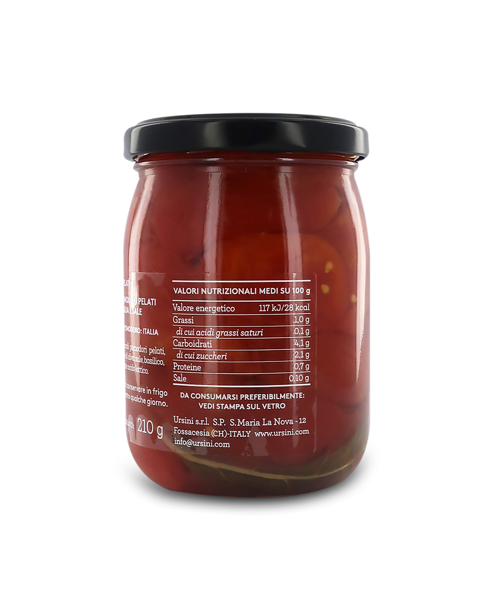 Ingredienti: pomodoro pelatino 99%, olio extravergine di oliva, sale, basilico, acqua, acidificante: acido lattico.