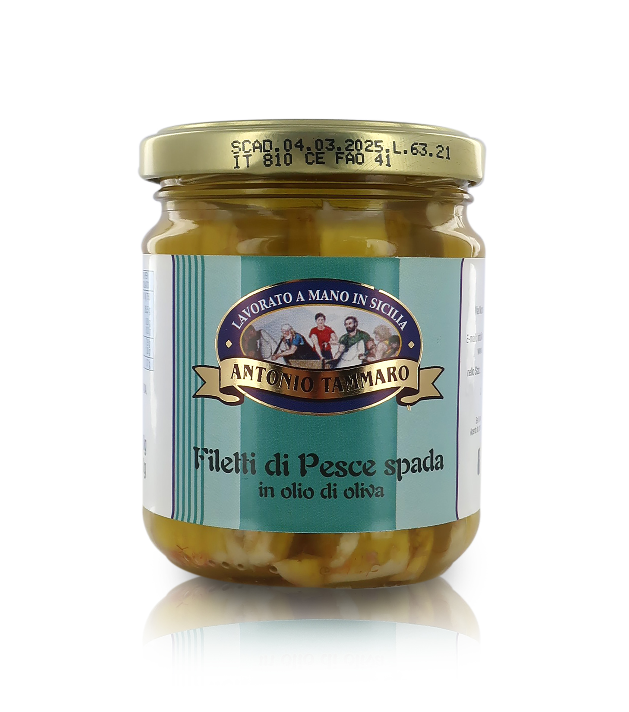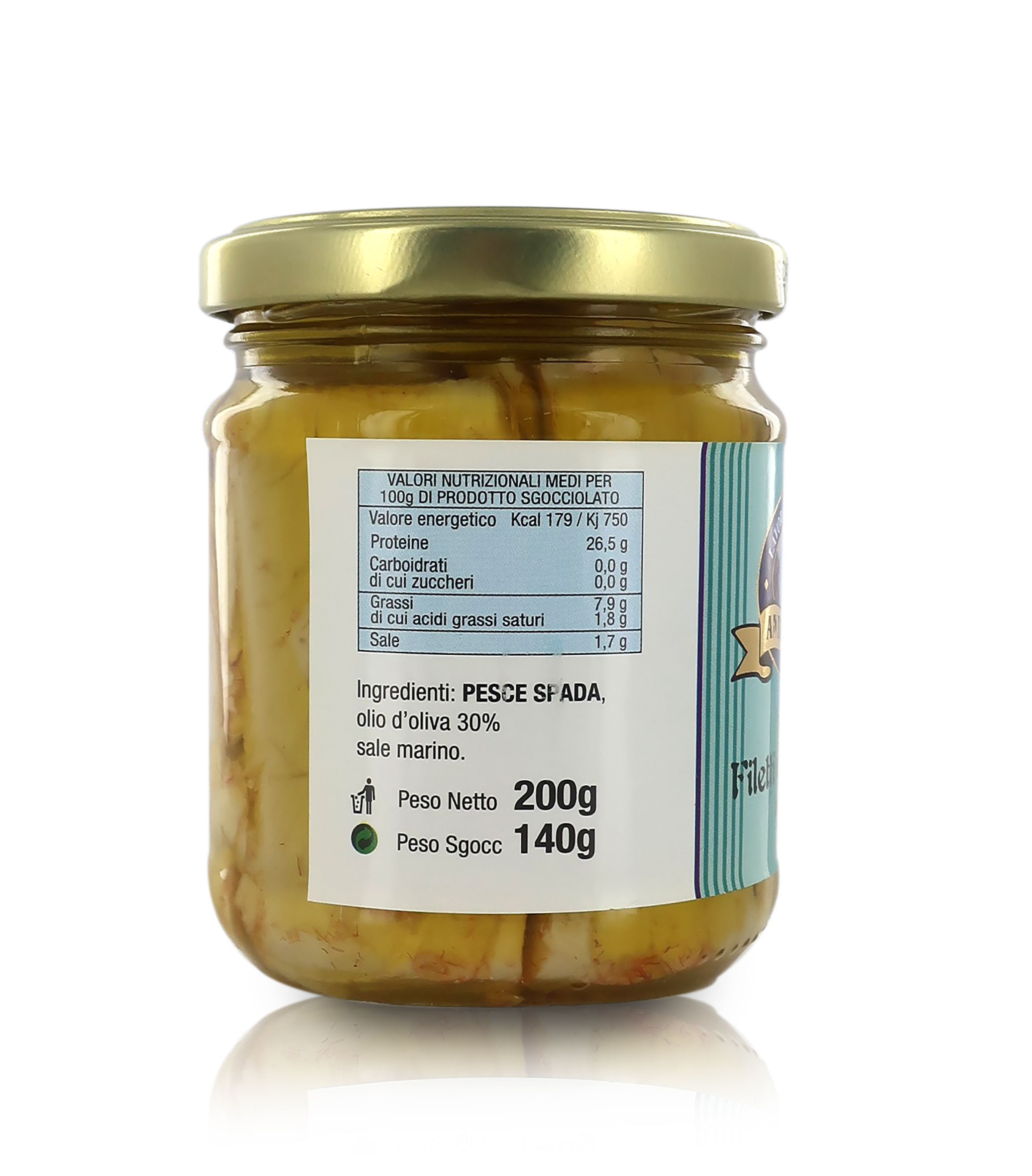 Ingredienti: PESCE SPADA, olio d’oliva, sale marino. Riporre in frigo dopo l’uso e consumare entro 1/3 giorni.