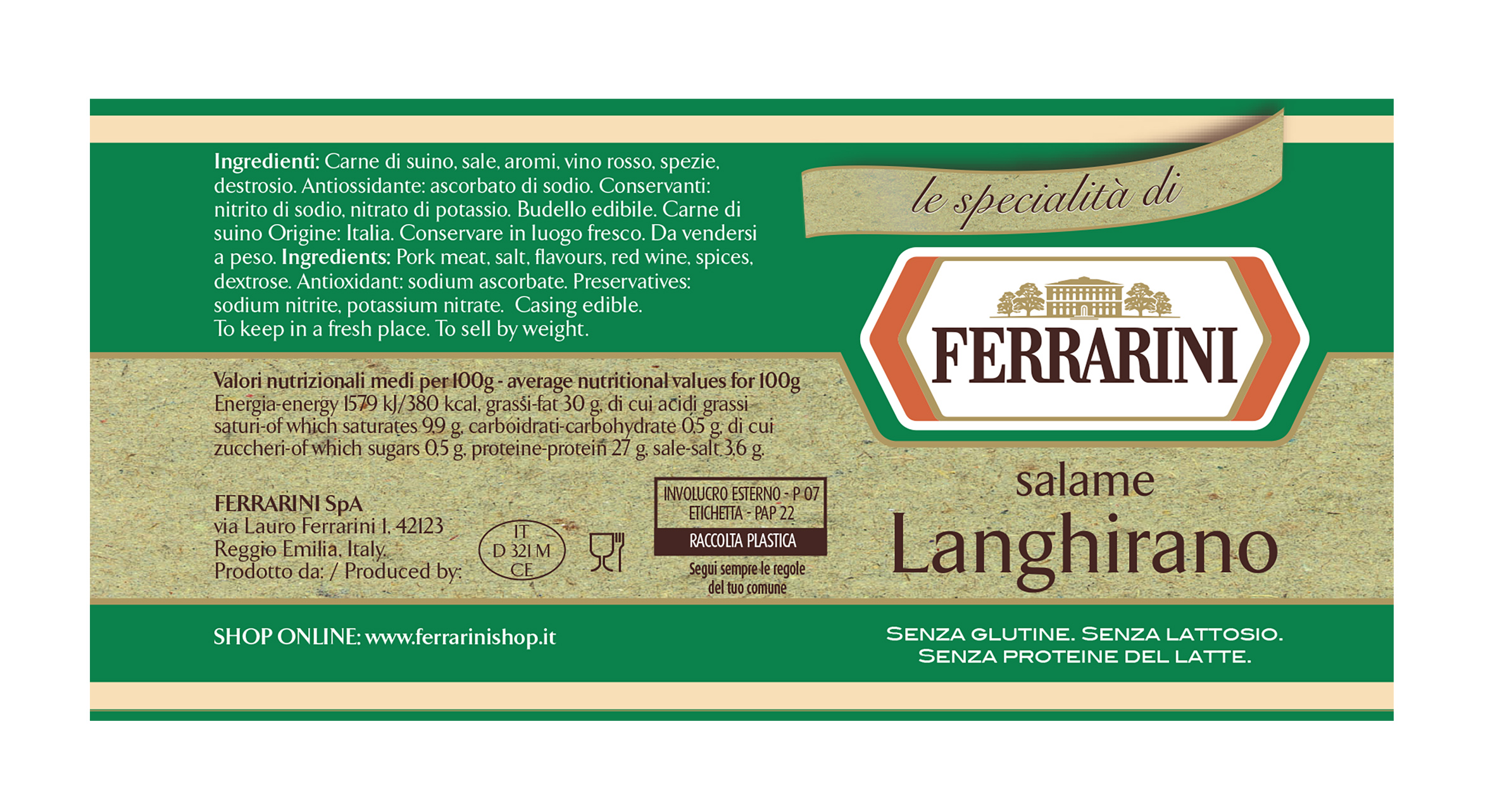 Salame Langhirano con pezzatura variabile dai 480 ai 580g. Questo salame ottenuto da 100% carni di suino italiano vanta una stagionatura minima di 40 giorni ed è realizzato con budello naturale suino e un macinato a grana media. Risulta adatto anche a persone con intolleranze, essendo senza glutine, senza lattosio, senza proteine del latte. È l'alleato perfetto per sfiziosi aperitivi, taglieri di salumi e formaggi, ancor meglio se accompagnato da un bicchiere di vino rosso Ferrarini. Il Salame di Langhirano Ferrarini è una prelibatezza italiana dal gusto unico e inconfondibile. Realizzato con carne di suino selezionata e opportunamente aromatizzata, questo salame è prodotto con una tecnica tradizionale che lo rende un prodotto di alta qualità.