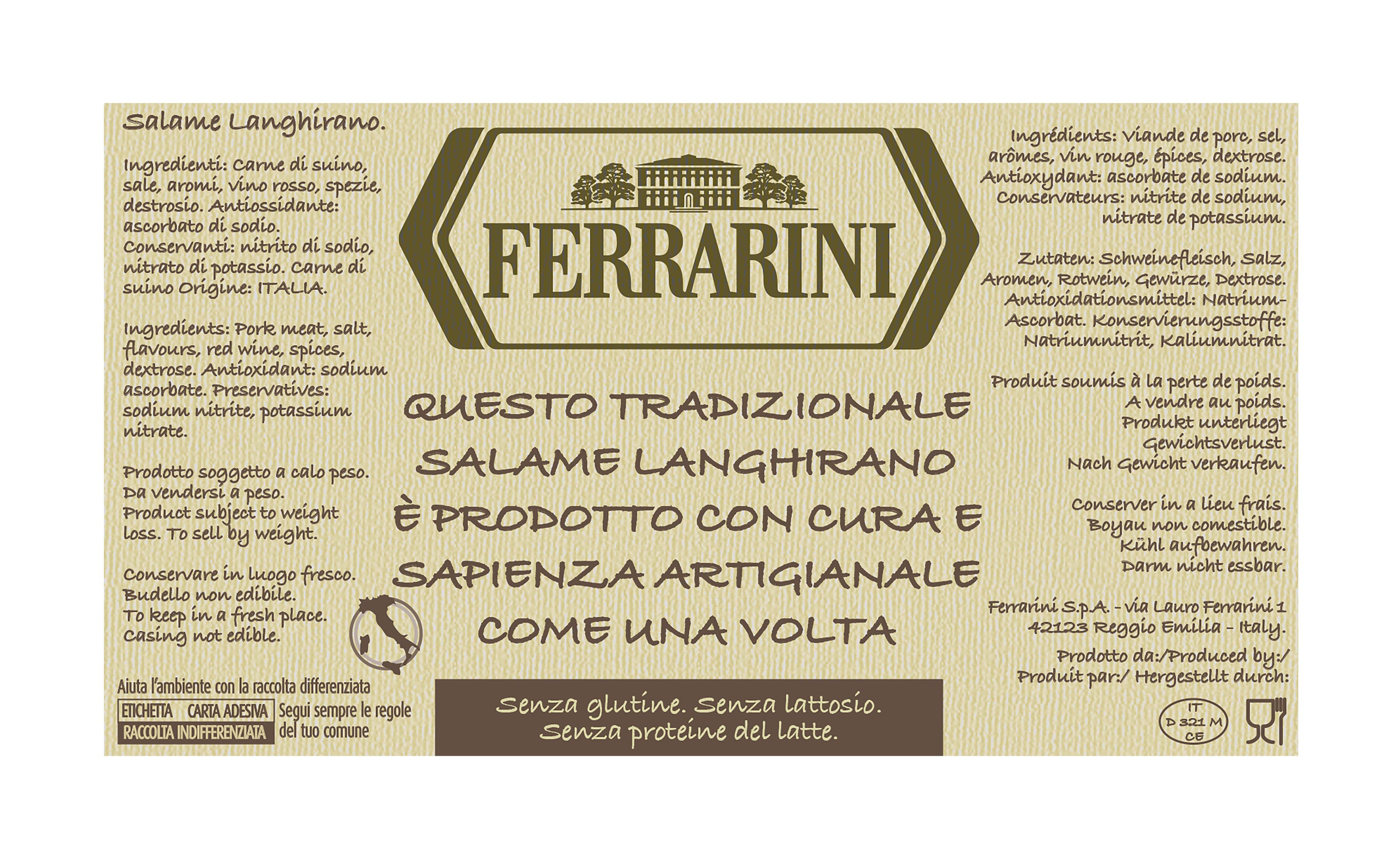 Salame Langhirano con pezzatura variabile dagli 850 a 950g. Questo salame ottenuto da 100% carni di suino italiano vanta una stagionatura minima di 5 / 6 settimane ed è realizzato con budello naturale suino e un macinato a grana media. Risulta adatto anche a persone con intolleranze, essendo senza glutine, senza lattosio, senza proteine del latte. È l'alleato perfetto per sfiziosi aperitivi, taglieri di salumi e formaggi, ancor meglio se accompagnato da un bicchiere di vino rosso Ferrarini. Il Salame di Langhirano Ferrarini è una prelibatezza italiana dal gusto unico e inconfondibile. Realizzato con carne di suino selezionata e opportunamente aromatizzata, questo salame è prodotto con una tecnica tradizionale che lo rende un prodotto di alta qualità.