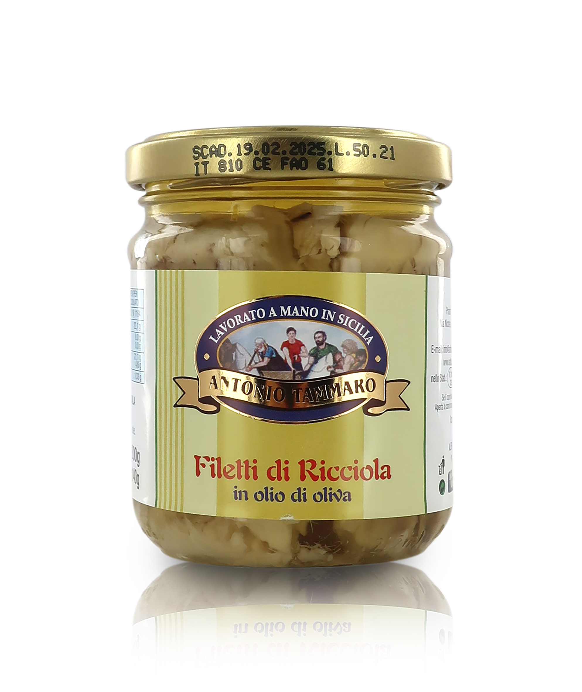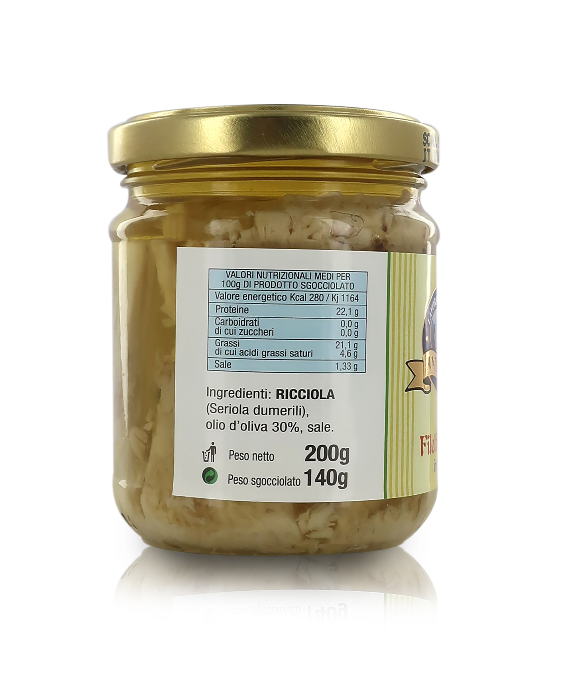 Ingredienti: RICCIOLA (Seriola dumerili), olio d'oliva 30%, sale. Riporre in frigo dopo l’uso e consumare entro 1/3 giorni.