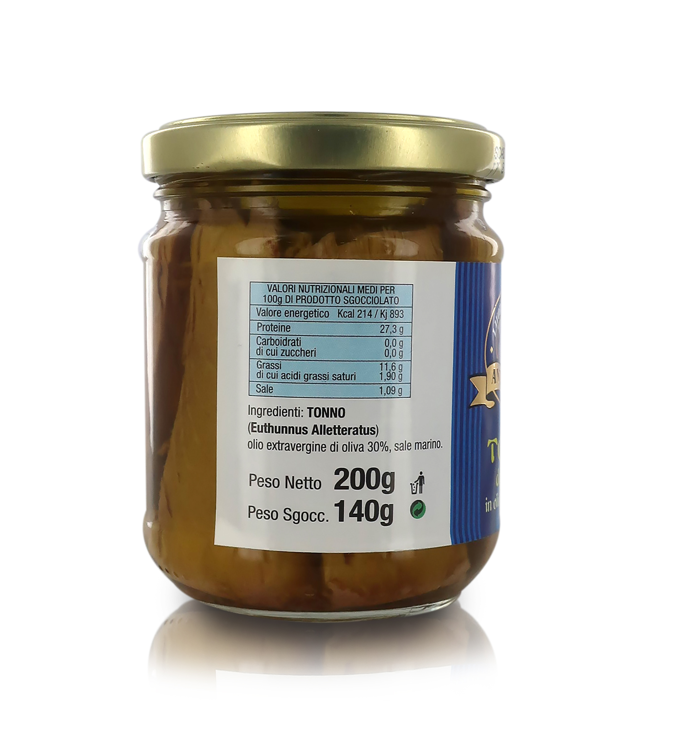 Tonnetto Alletterato del Mediterraneo, conservato sott'olio extravergine d'oliva, in vasetto da 200g.