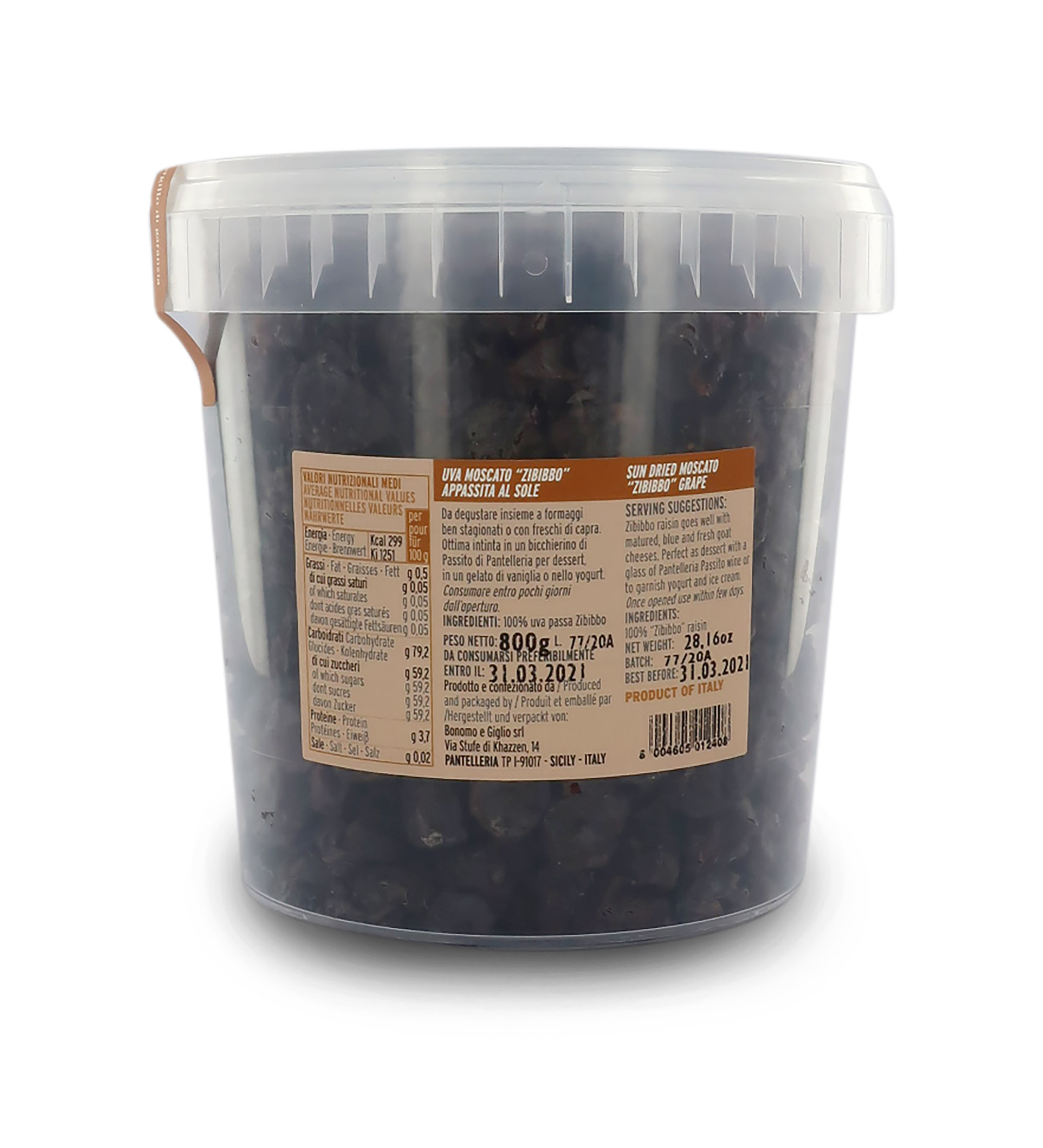 L'iconica Uva Moscato Zibibbo, simbolo dell'isola di Pantelleria, risulta fortemente aromatica, dolce e pastosa, con una nota croccante data dai semi all’interno, che però non risultano né duri, né allappanti / tannici alla masticazione. L'Uva Zibibbo essiccata al sole è proposta in comodo vasetto richiudibile, sotto forma di acini già staccati dal grappolo. Ideale come dessert a fine pasto ed energizzante dopo l'attività sportiva. Indicata anche per la preparazione di dolci.
