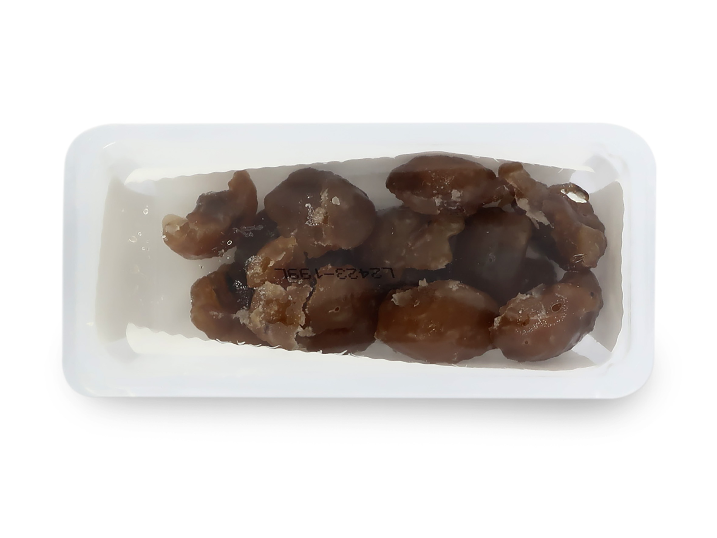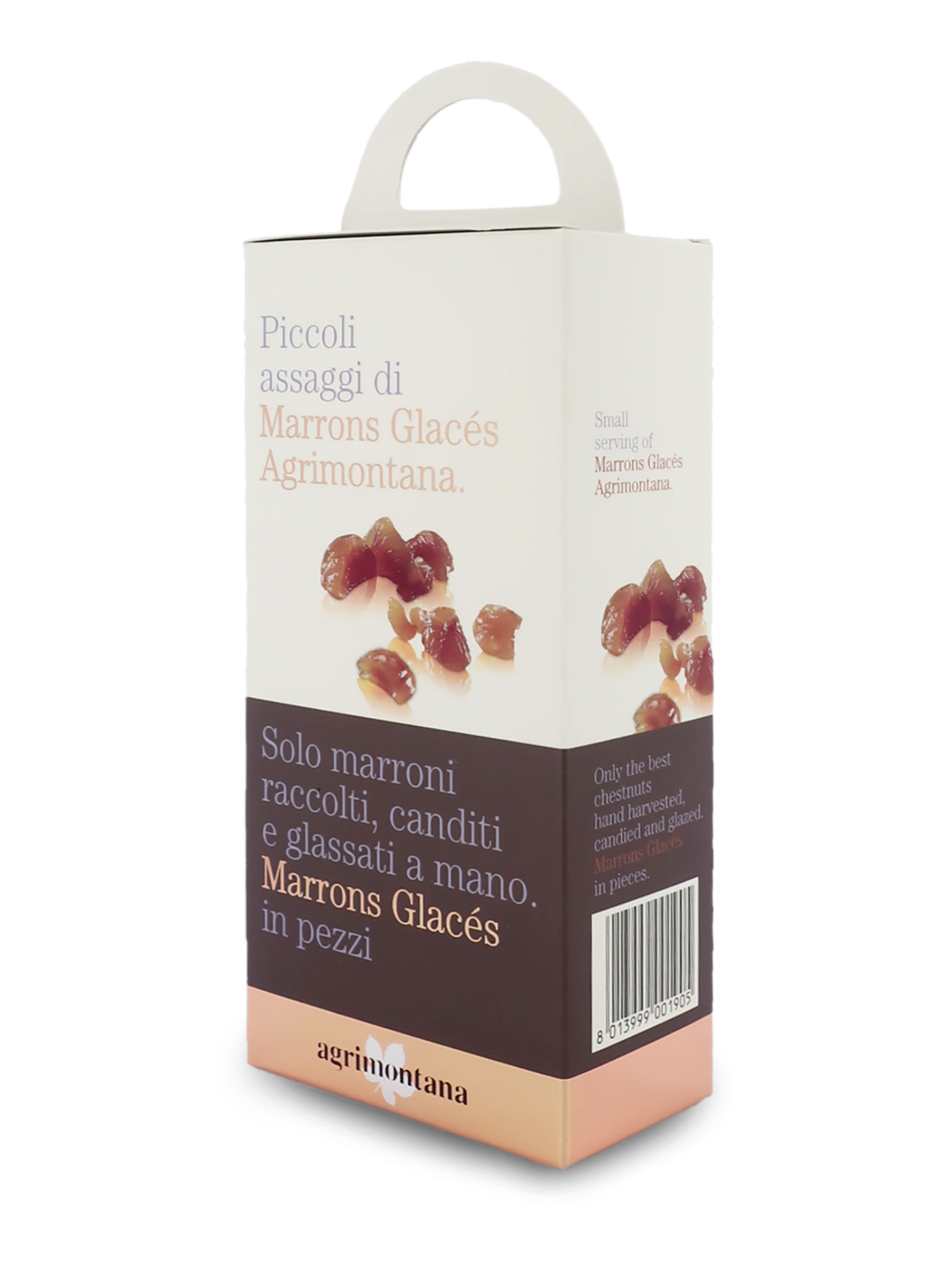 Piccoli pezzi di marroni, realizzati con castagne raccolte principalmente dal centro Italia (Appennino Tosco-Emiliano, nelle province di Firenze e Bologna). Pratico astuccio di carta con manico (160g).