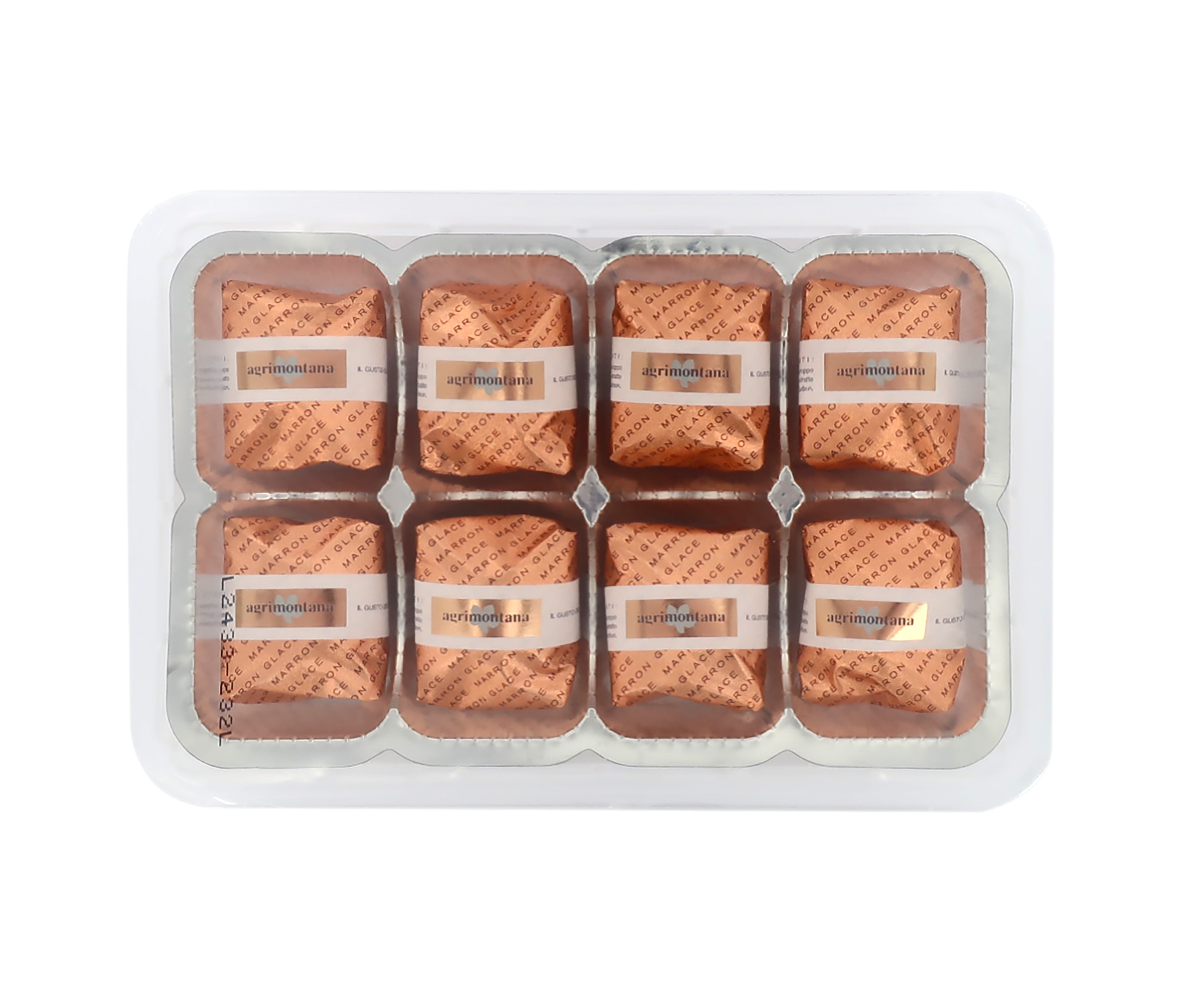 Confezione con vaschetta sigillata contenente 8 marroni canditi incartati singolarmente (160 grammi) - Linea "I Classici".