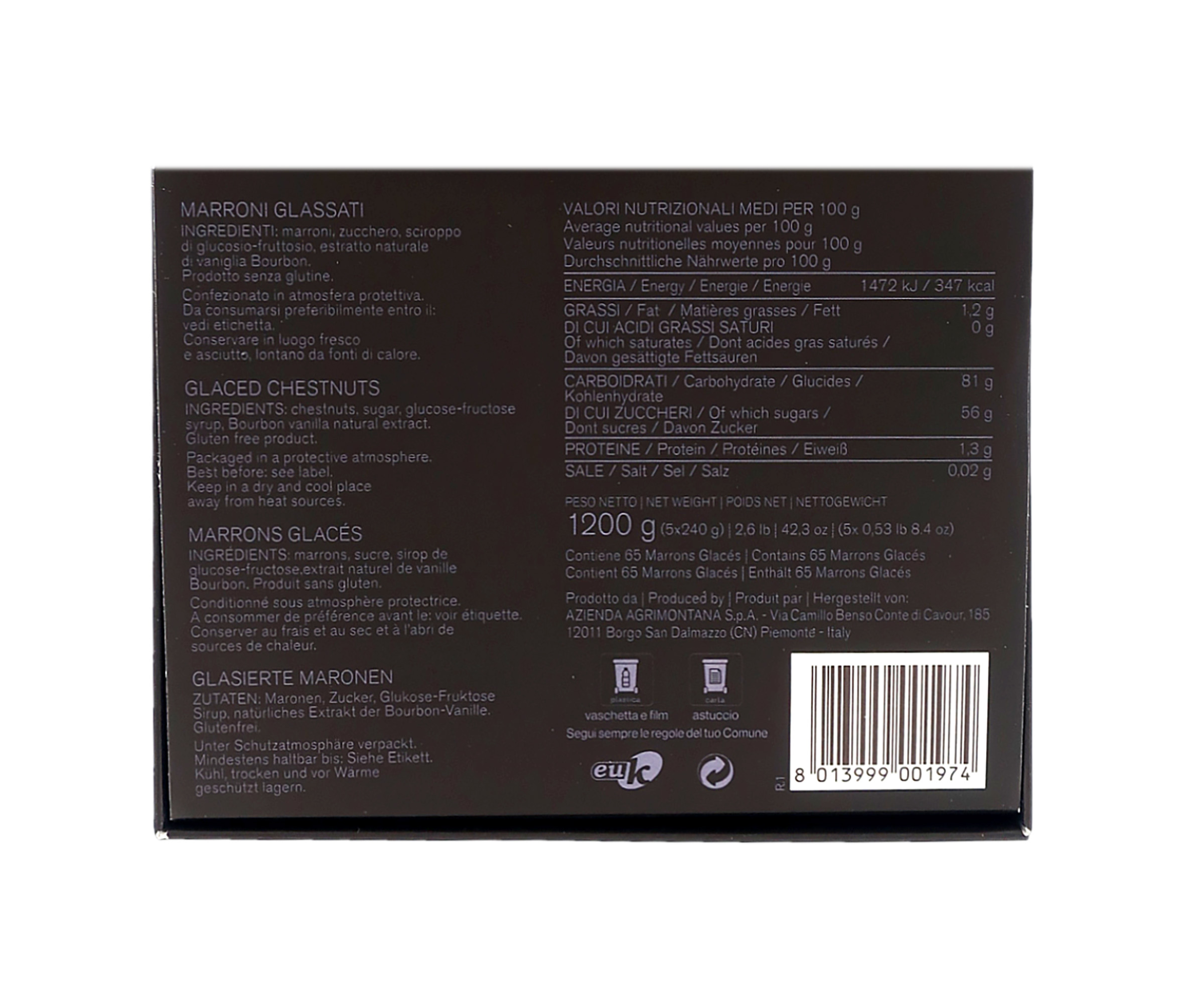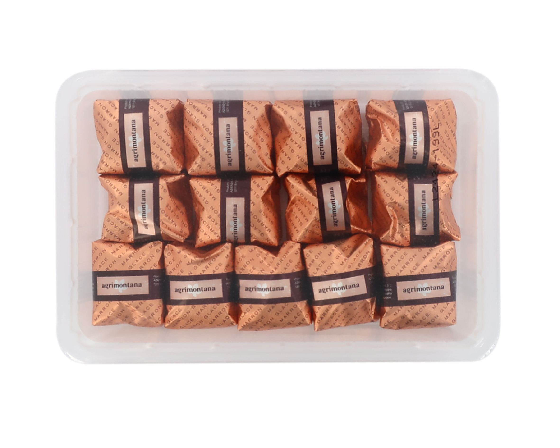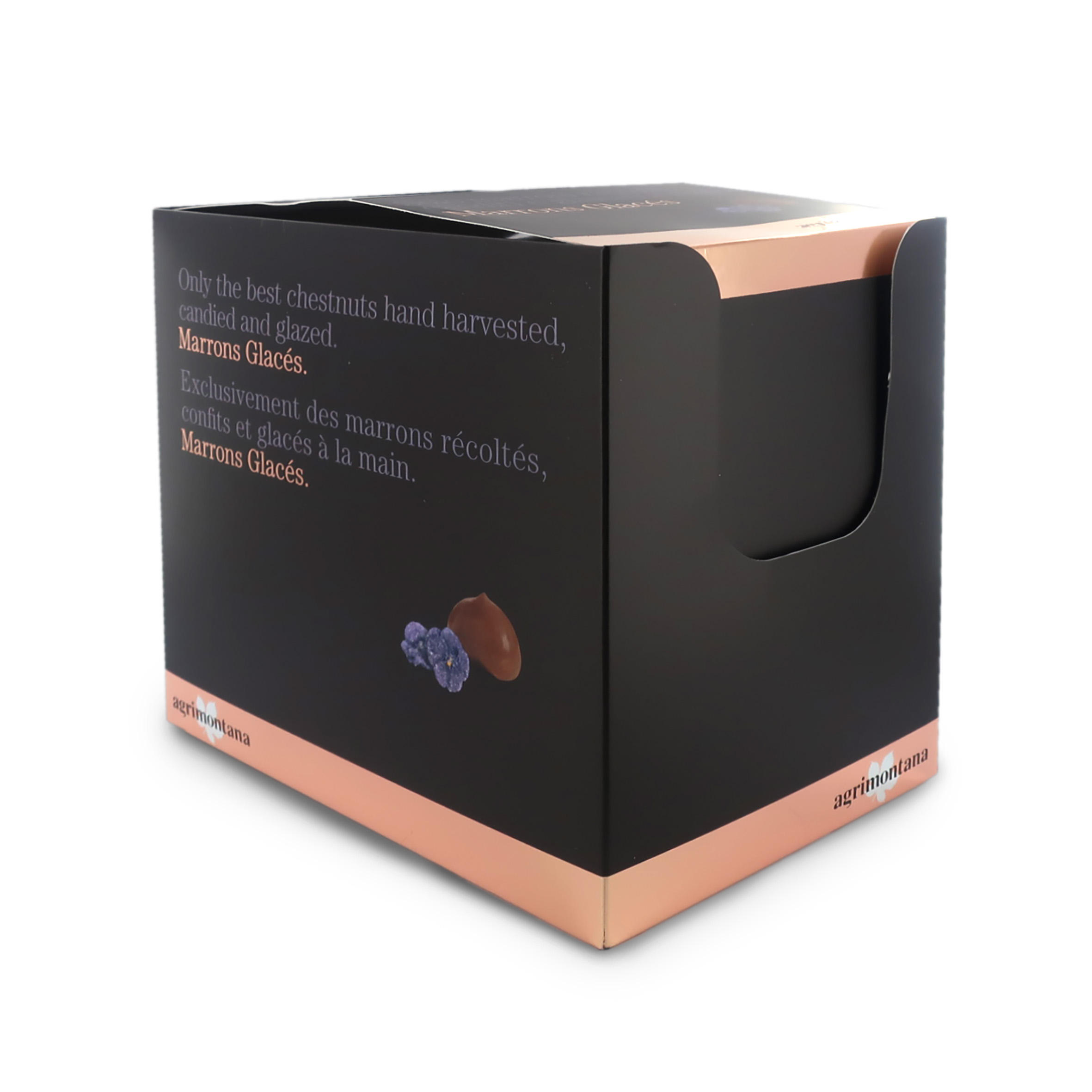 Confezione da esposizione, ideale per settore Ho.Re.Ca., contenente 5 vaschette sigillate di marron glacé. Ogni vaschetta contiene 13 marron glacé incartati singolarmente e ha un peso netto di 240g.