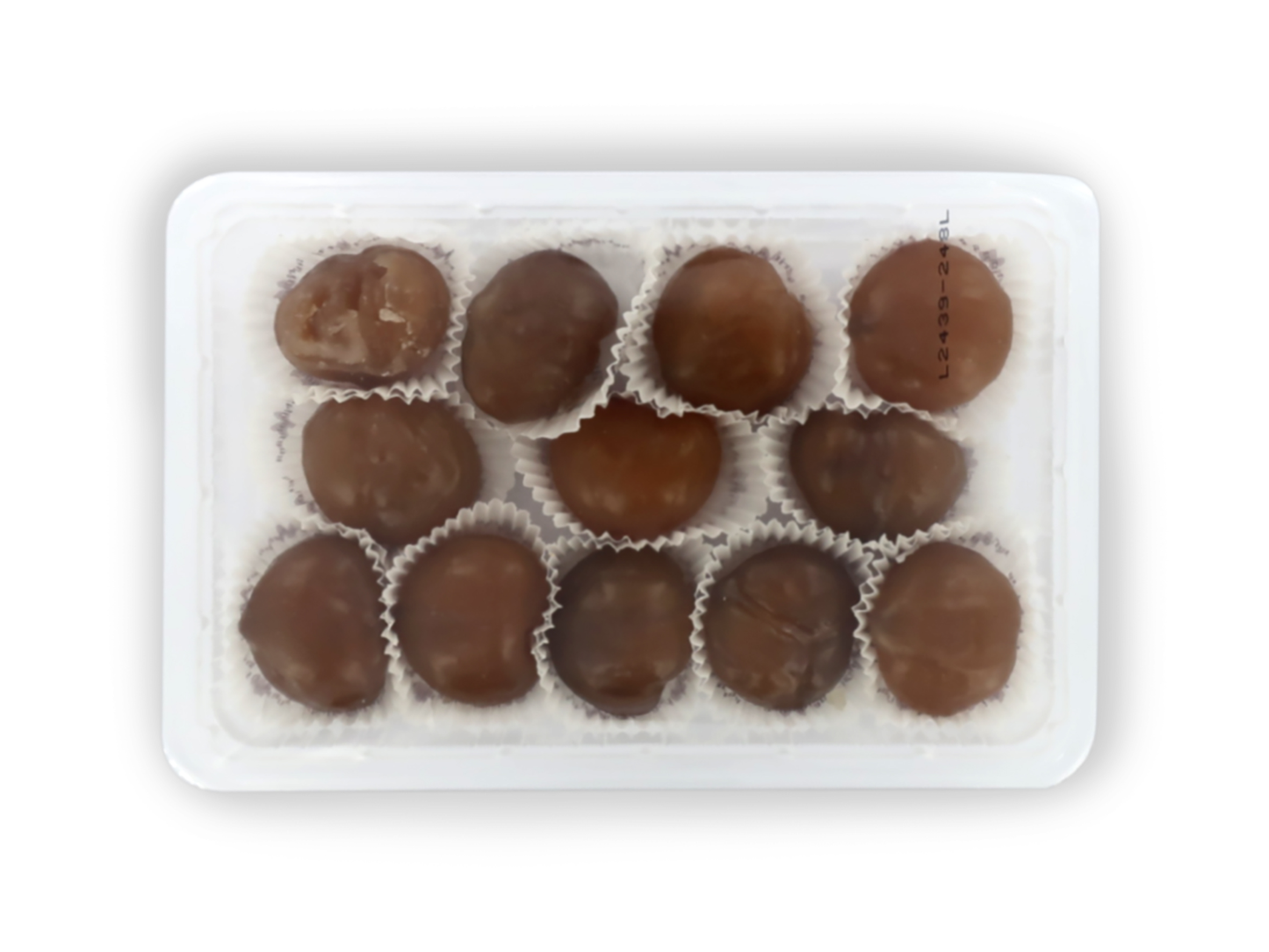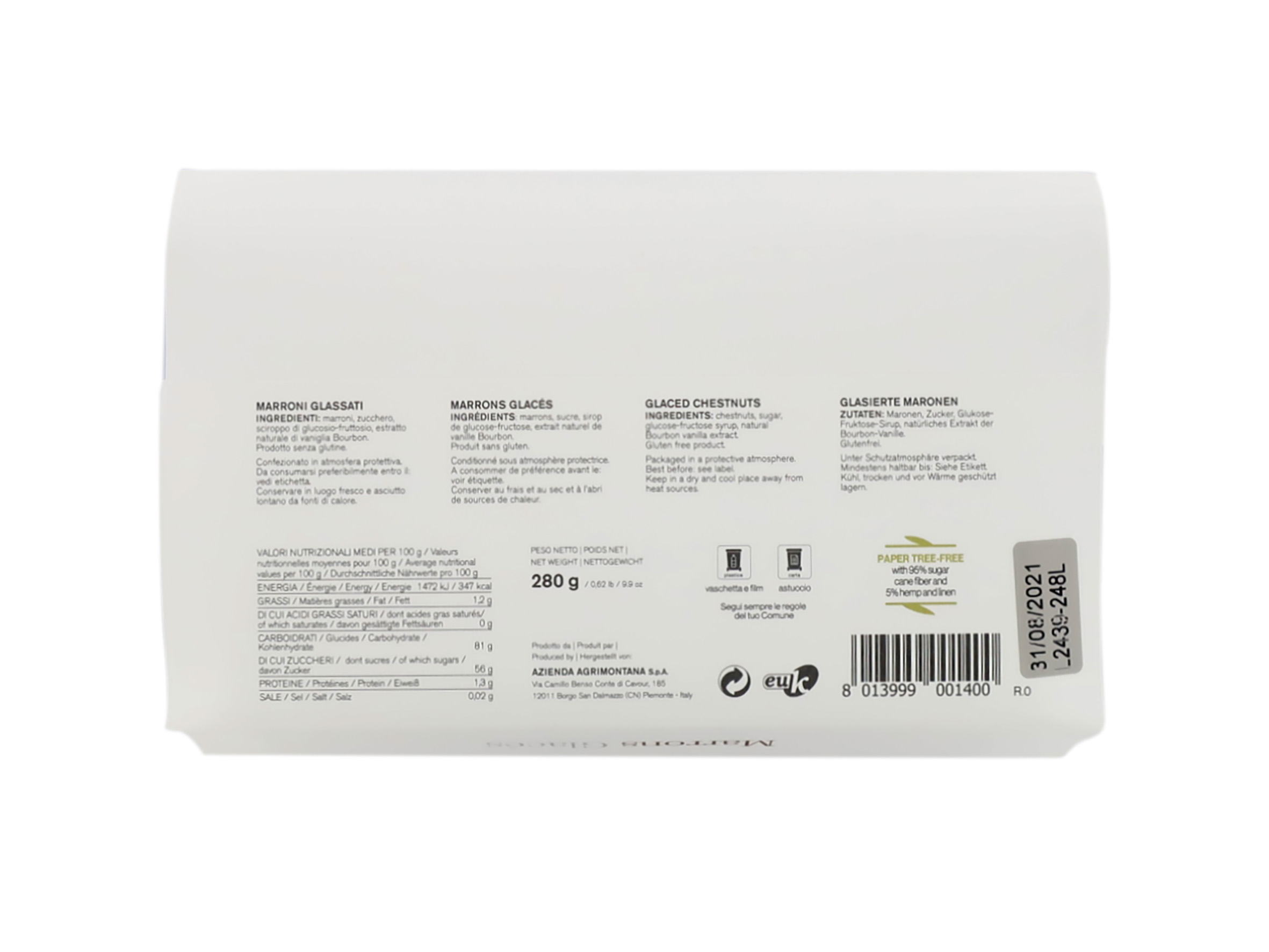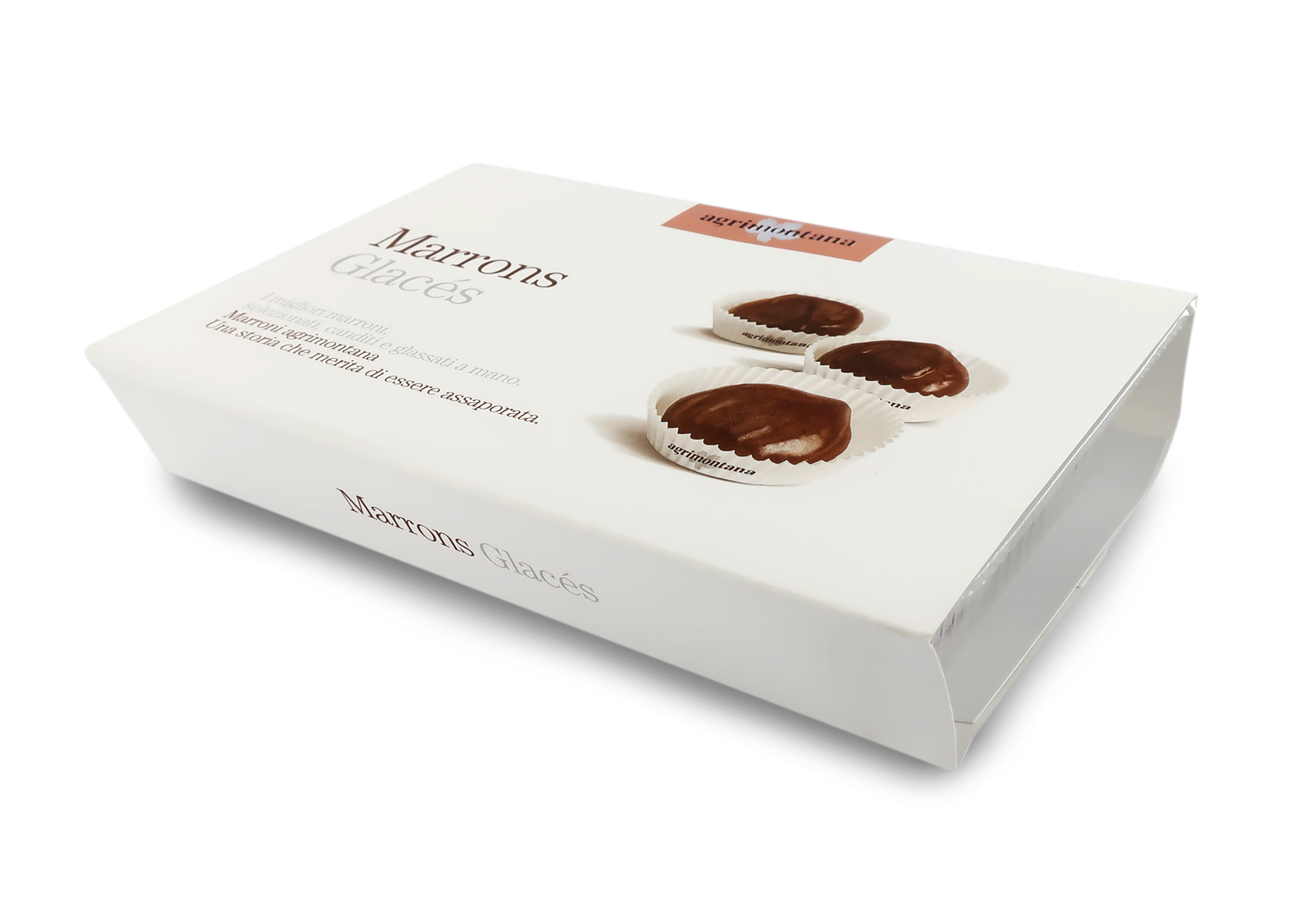 Confezione con vaschetta sigillata in atmosfera protettiva, contenente marron glacé in pirottino (280 grammi) - Linea "I Classici".