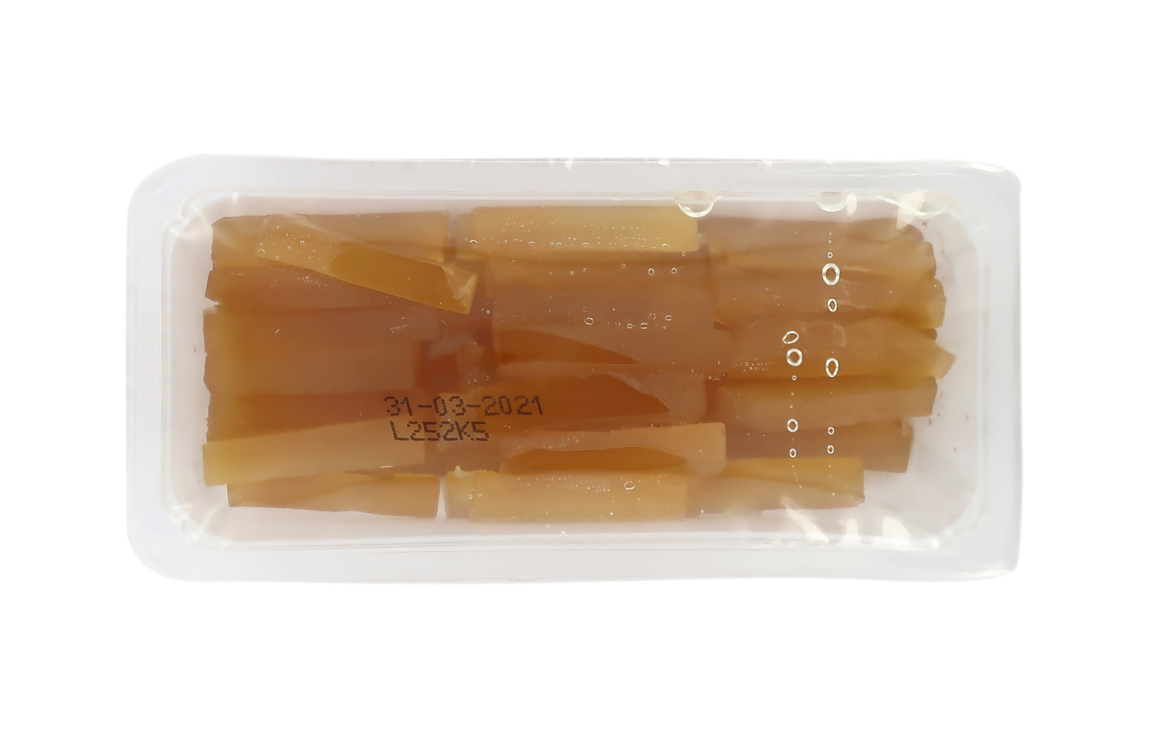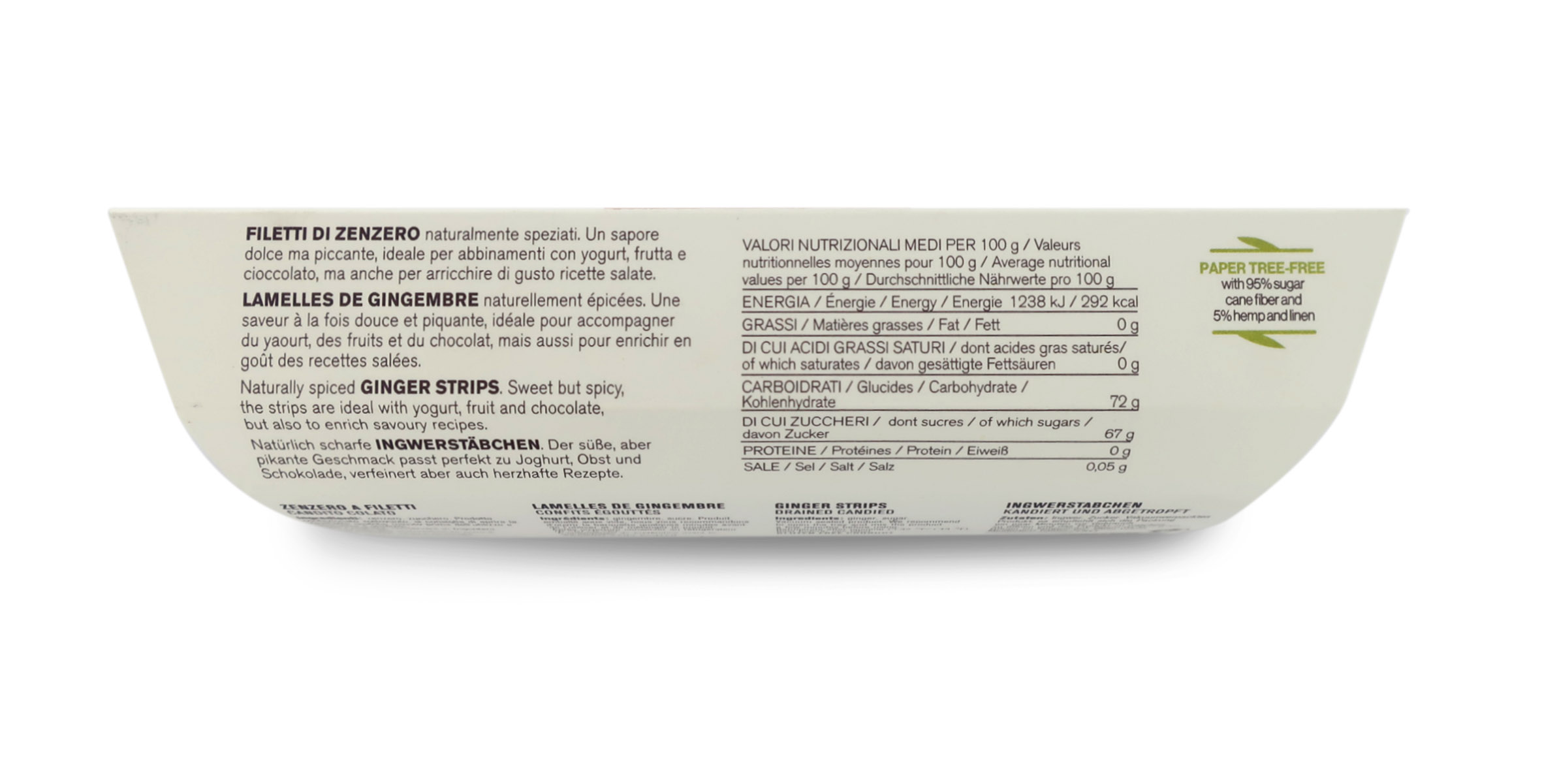 Zenzero candito in filetti di fattura artigianale, in confezione da 200g. I filetti di zenzero candito sono contenuti in una pratica vaschetta sotto vuoto, leggermente pastorizzata, appositamente sviluppata per preservare i sapori e i profumi della canditura.