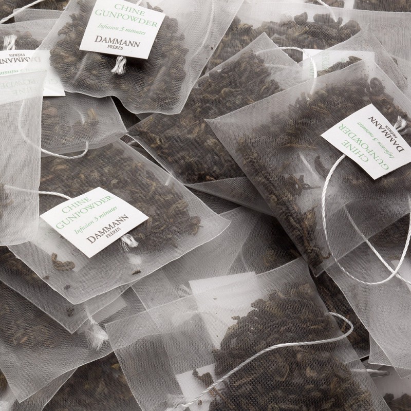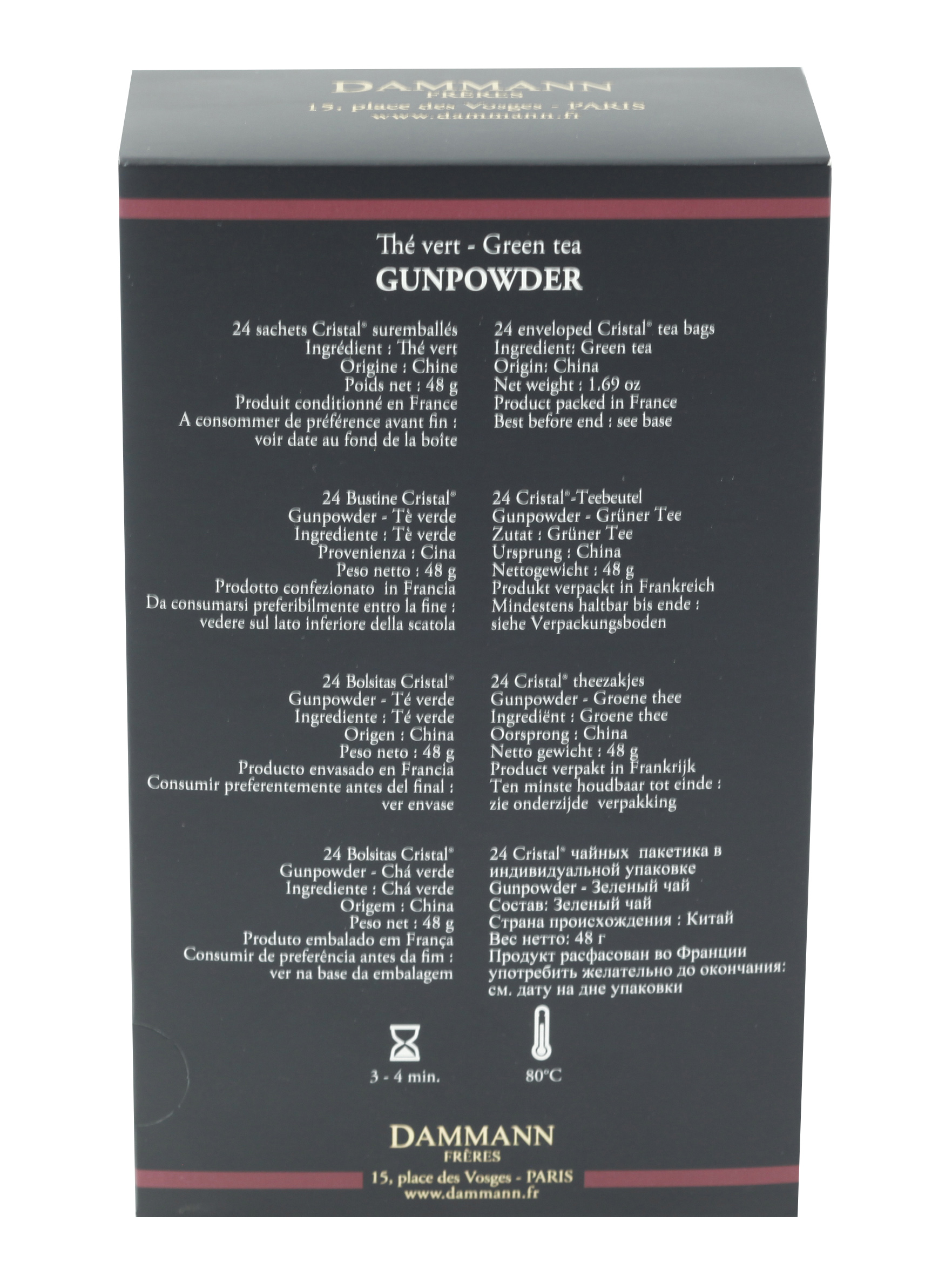 Il tè verde Gunpowder di Dammann Frères è contenuto in esclusive e pratiche bustine "Cristal" incartate singolarmente.