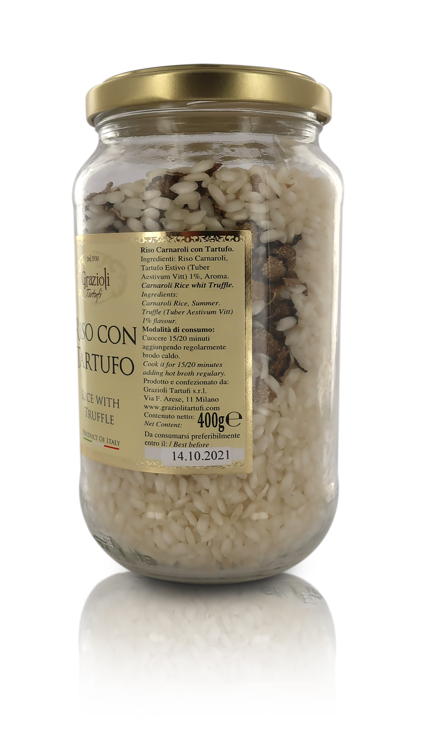 Ingredienti: riso Carnaroli, tartufo estivo (Tuber Aestivum Vitt) 1%, aroma.