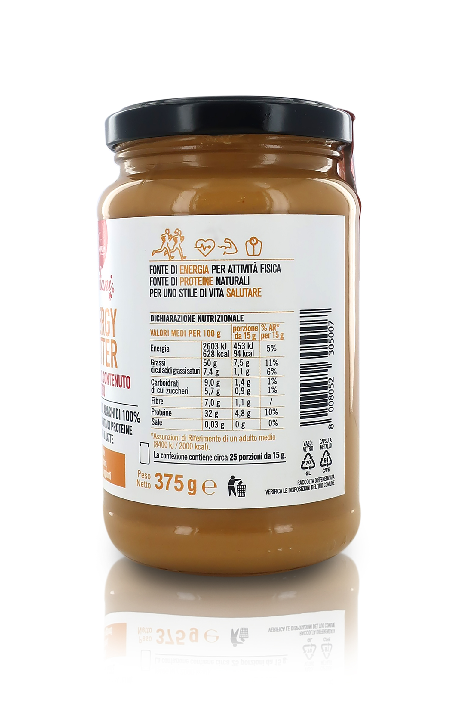 Ingredienti: ARACHIDI tostate (100%) (origine: UE e non UE), proteine isolate microfiltrate del siero di LATTE. Può contenere tracce di MANDORLE, NOCCIOLE e PISTACCHI. L'eventuale separazione dell'olio è un processo naturale, per ricostituirlo basta mescolare. Dopo l'apertura, richiudere bene e conservare in luogo fresco e asciutto, al riparo dalla luce e da fonti di calore. La data di scadenza si riferisce al prodotto integro in confezione non aperta.