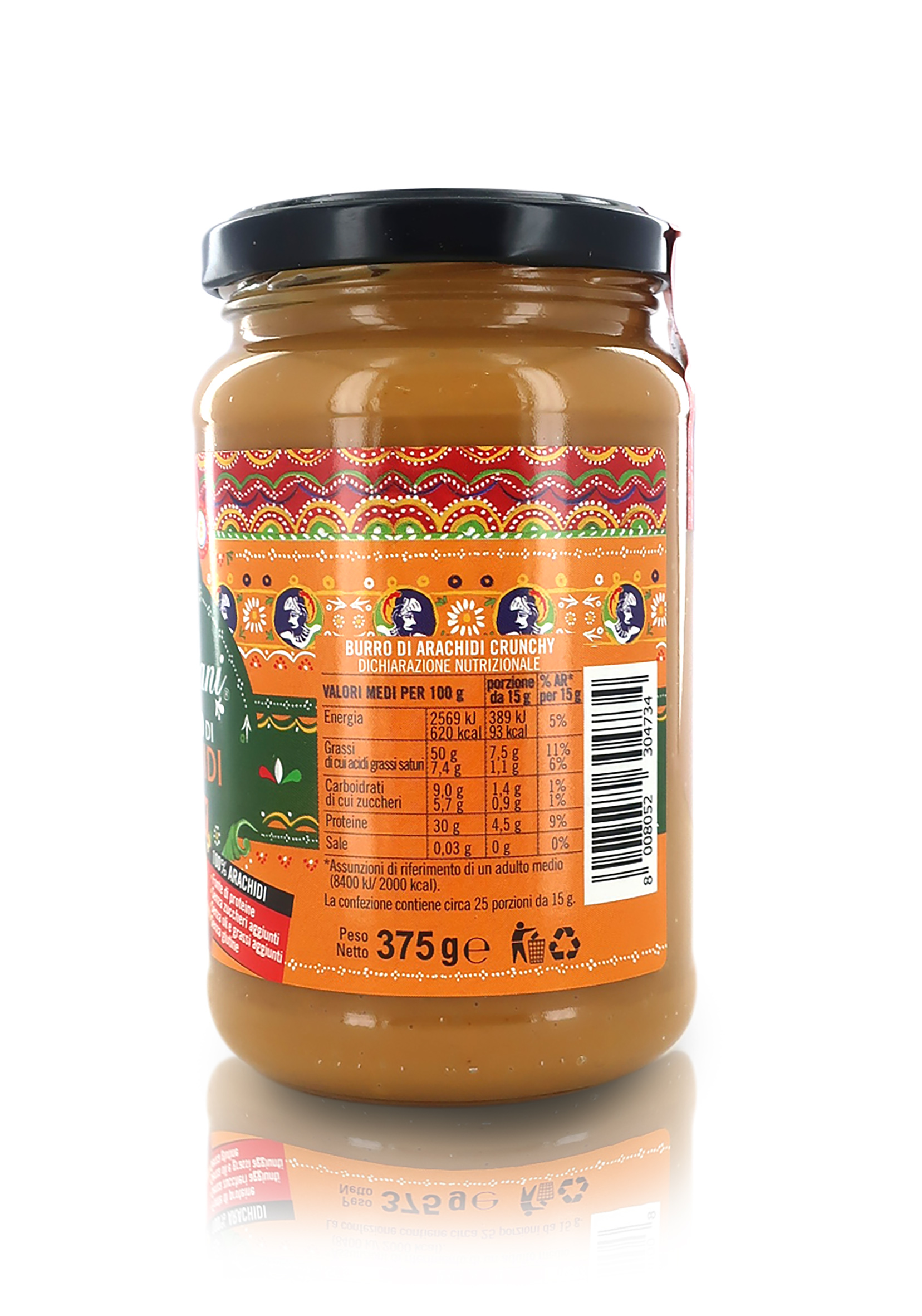 Ingredienti: ARACHIDI tostate (100% arachidi). Origine: UE e non UE. Può contenere tracce di MANDORLE, NOCCIOLE e PISTACCHI. L'eventuale separazione dell'olio è un processo naturale, per ricostituirlo basta mescolare. Dopo l'apertura, richiudere bene e conservare in luogo fresco e asciutto, al riparo dalla luce e da fonti di calore. La data di scadenza si riferisce al prodotto integro in confezione non aperta.
