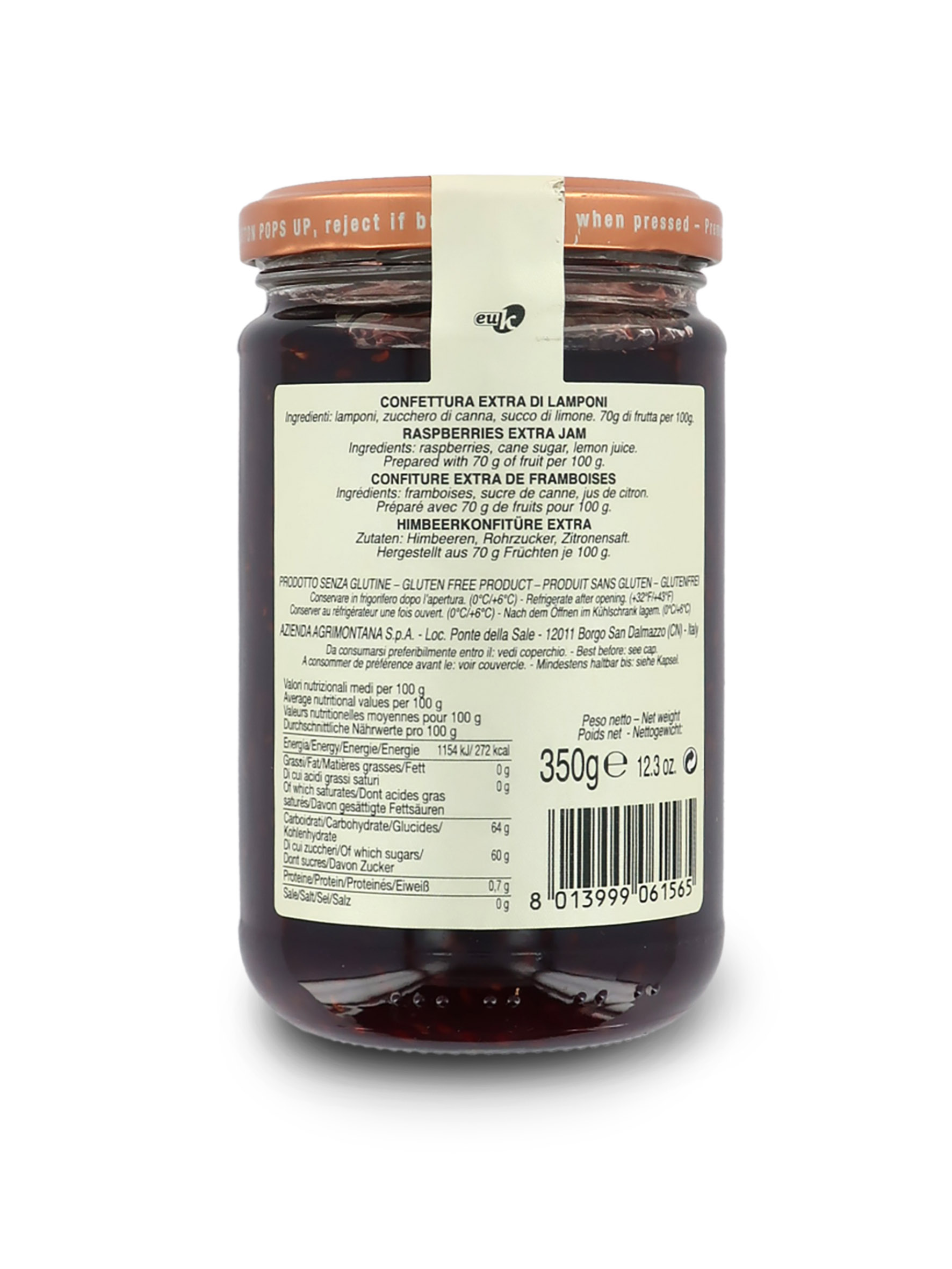 12 vasetti di confettura extra di lamponi in vasetto da 350 grammi (12 x 350g = 4 chili e 200 grammi di confettura).