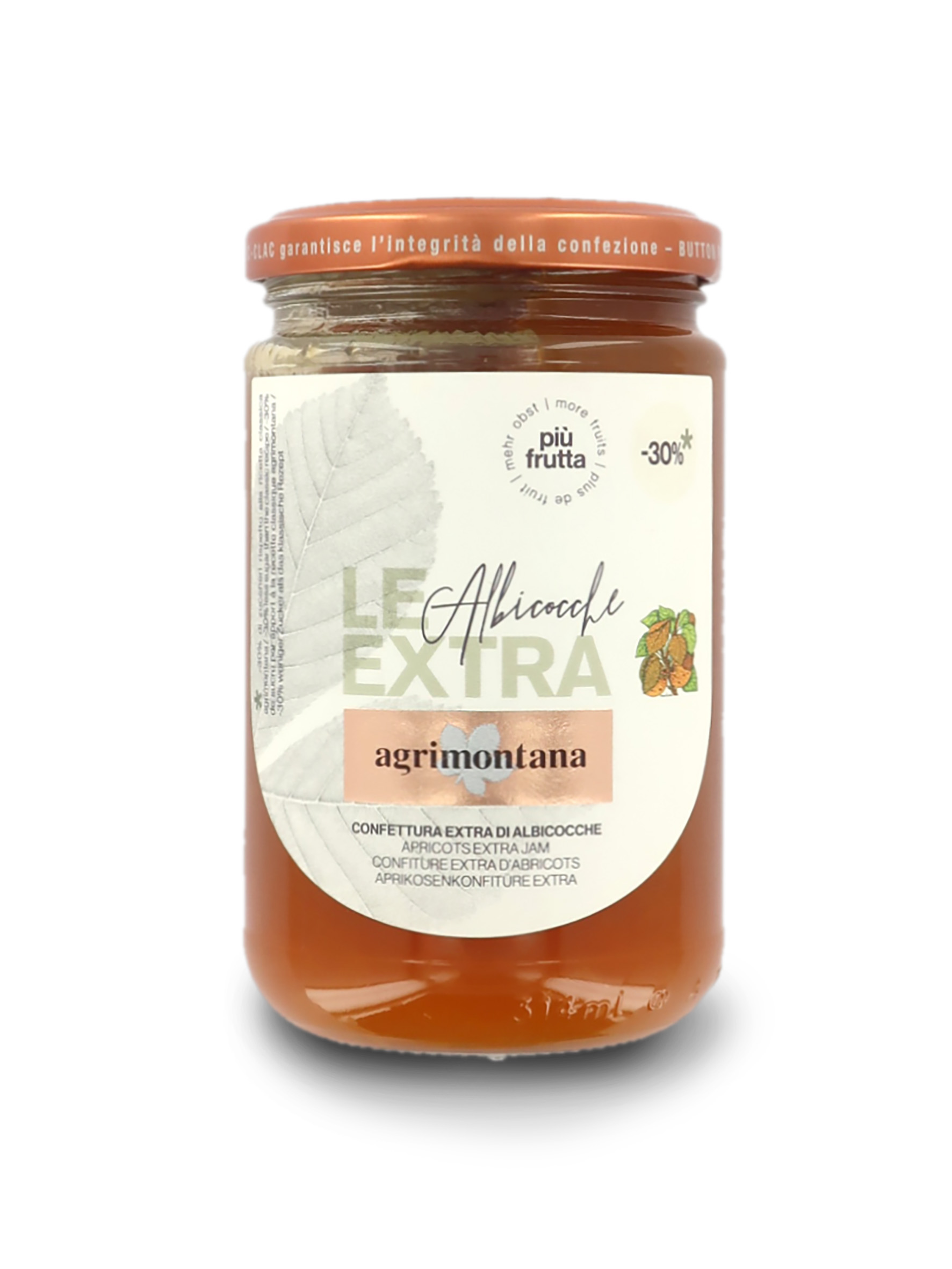 Confettura extra alle albicocche appartenente alla linea "Le Extra", caratterizzata da un contenuto di zucchero inferiore (-30%) rispetto alla ricetta di confetture extra standard Agrimontana.