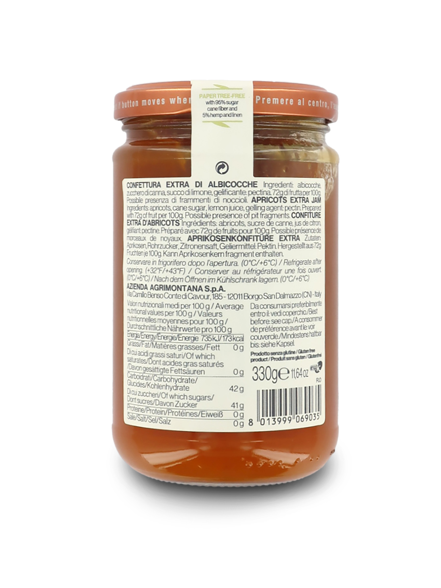In linea con l'approccio "green" di Agrimontana, l'etichetta è realizzata con materiale cartaceo riciclabile non proveniente da alberi.