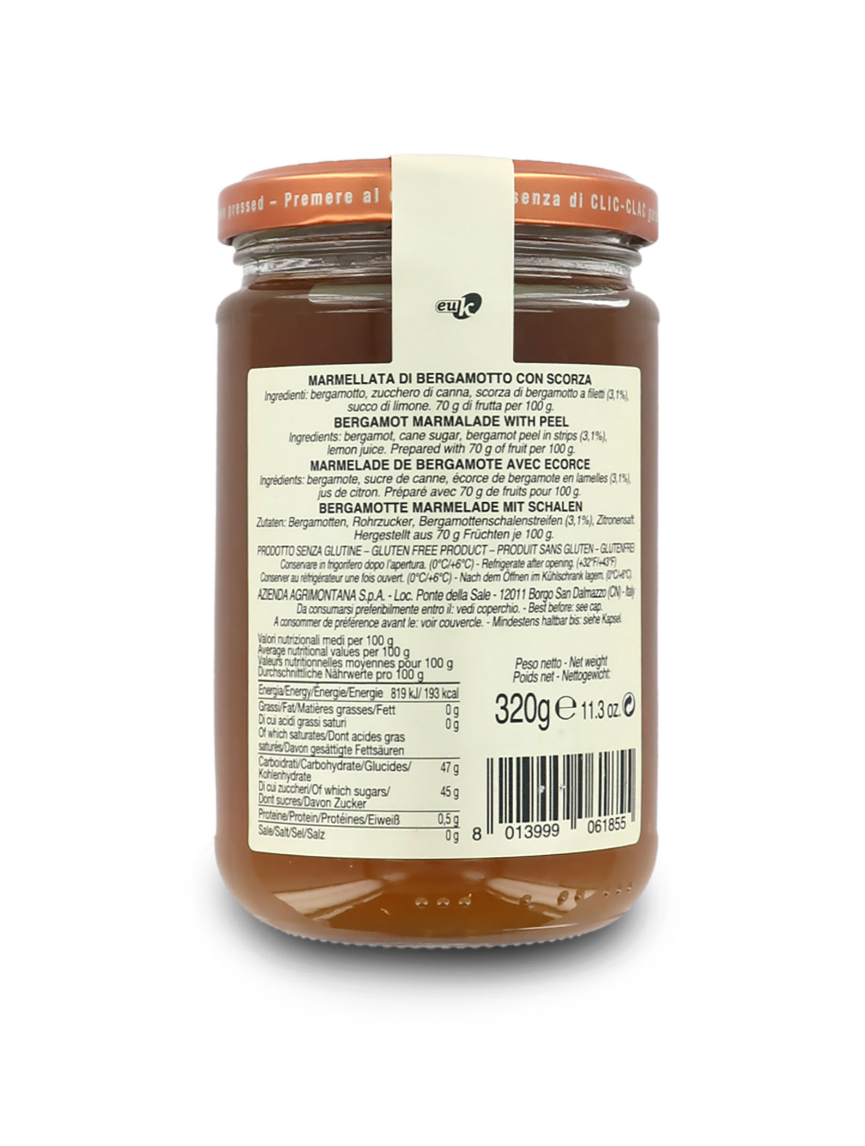 Confettura extra di bergamotto in vasetto da 320 grammi. Piacevolmente impreziosita da scorzette di bergamotto.