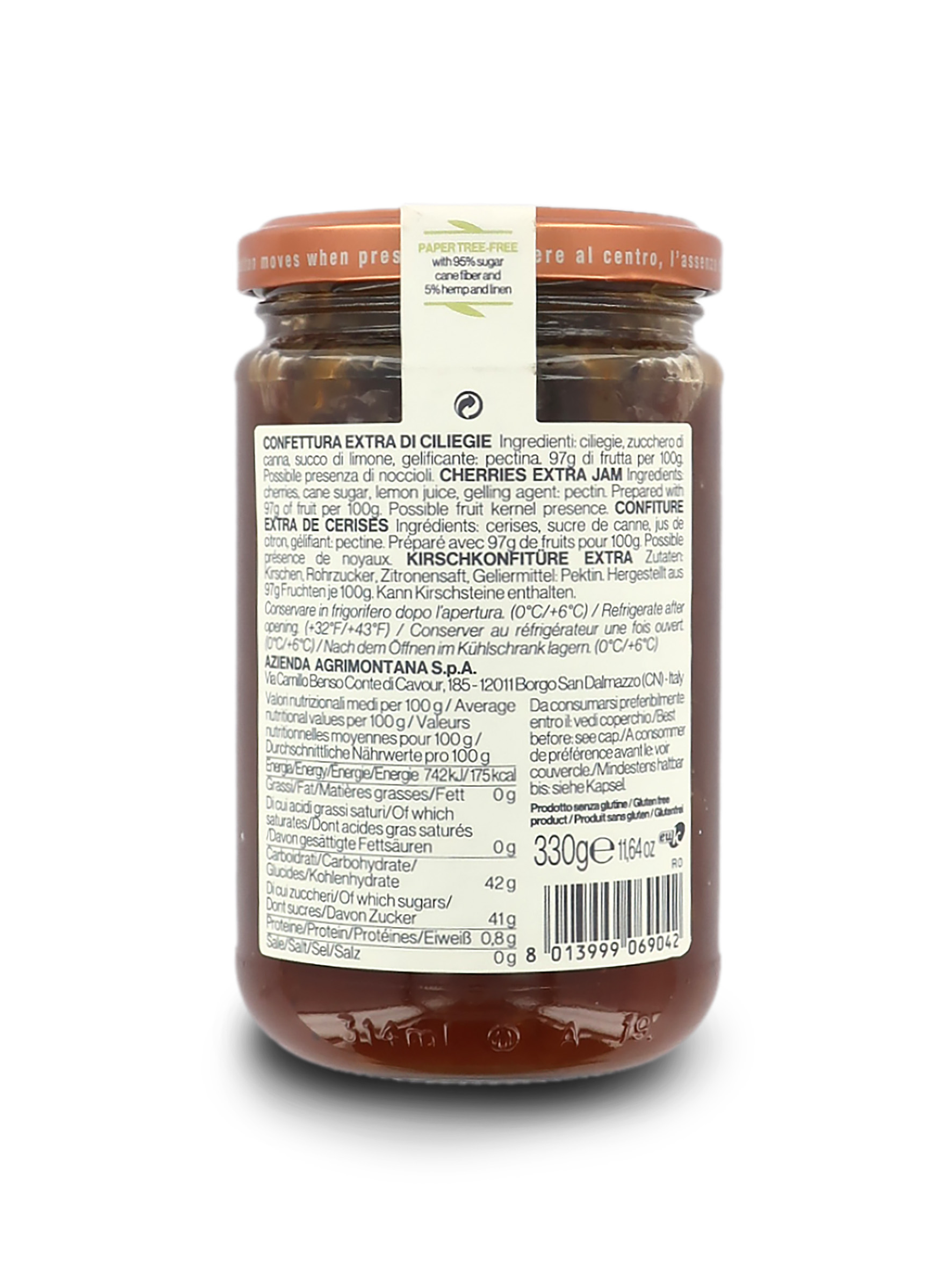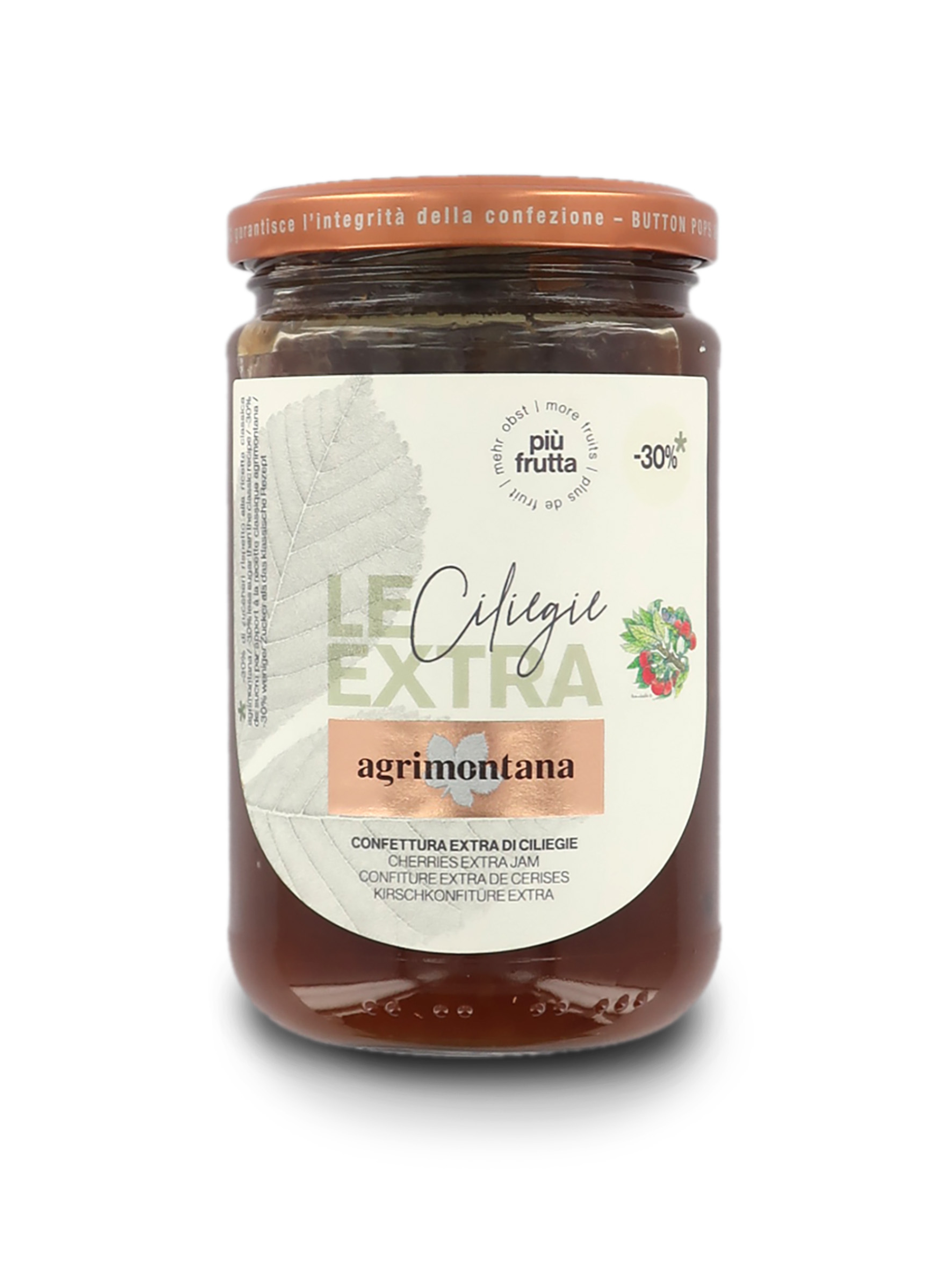 Confettura extra alle ciliegie appartenente alla linea "Le Extra", caratterizzata da un contenuto di zucchero inferiore (-30%) rispetto alla ricetta di confetture extra standard Agrimontana.