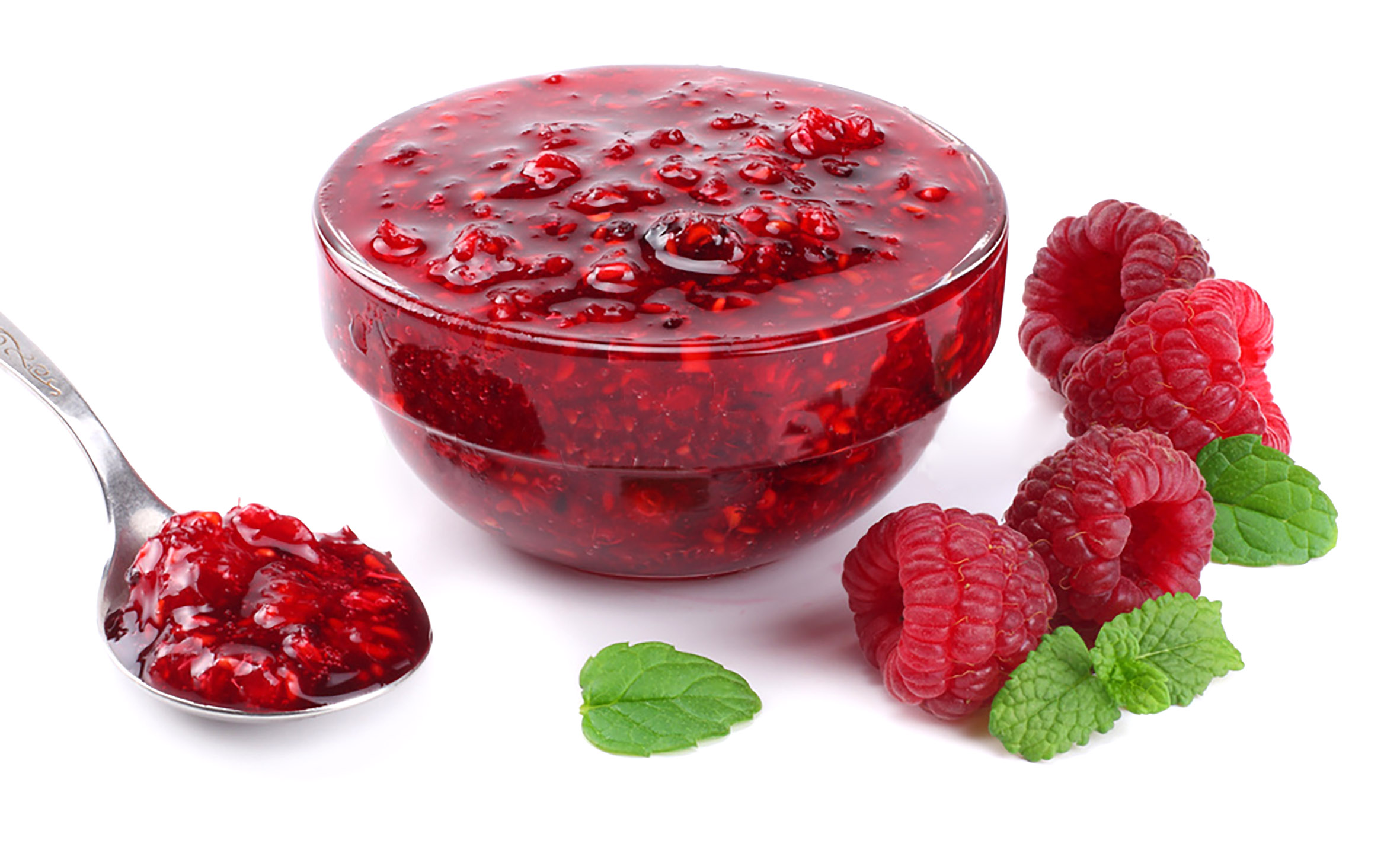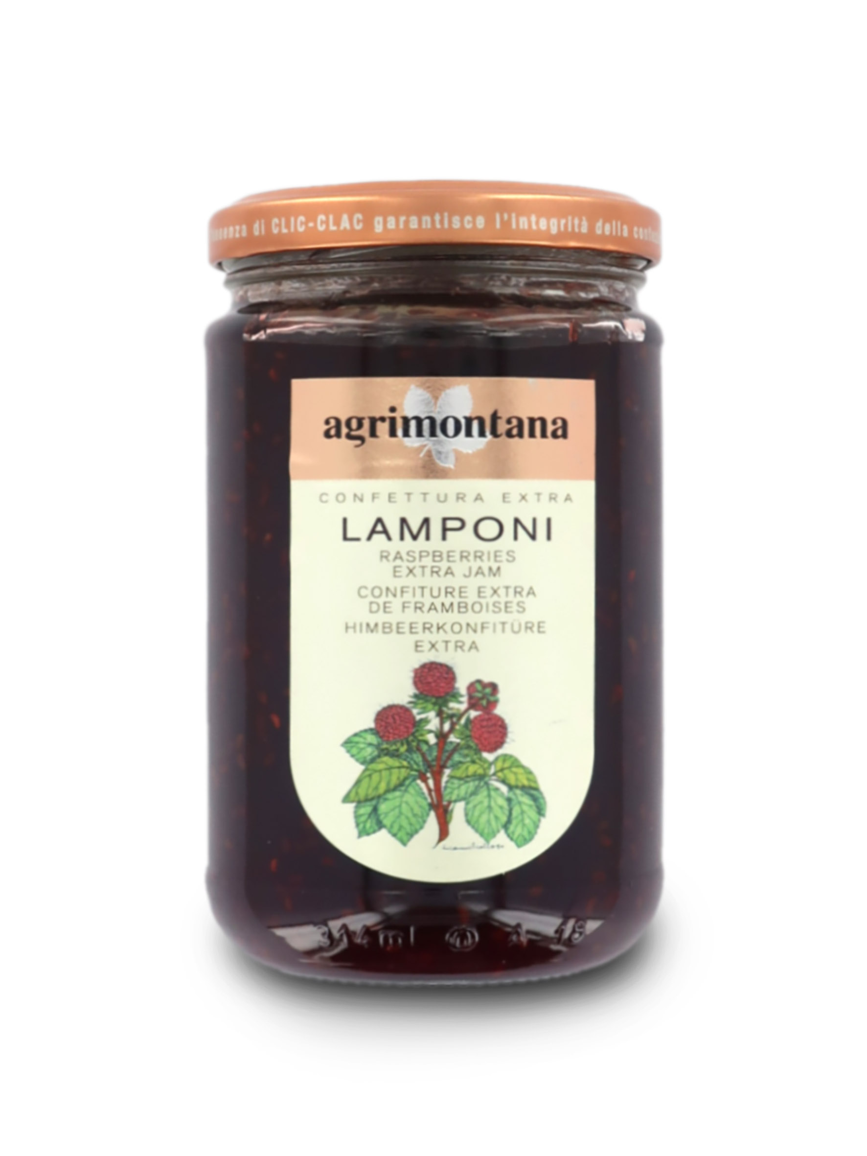 Confettura extra di lamponi in vasetto da 350 grammi.