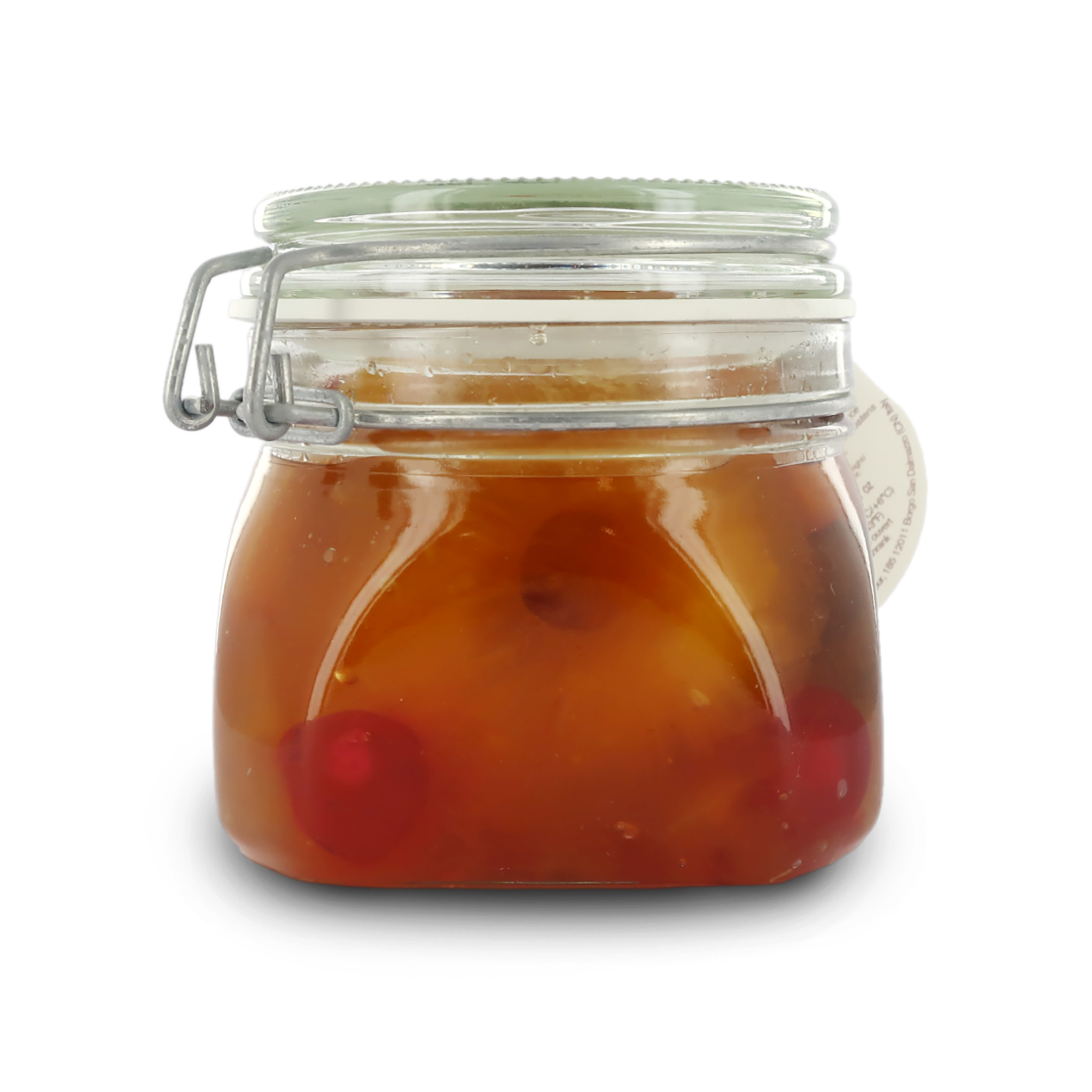 Mostarda classica italiana alla frutta mista, in vaso ermetico da 650 grammi. Viene impiegata frutta di primissima qualità (arance, pere, ananas, clementine, ciliegie, fichi).