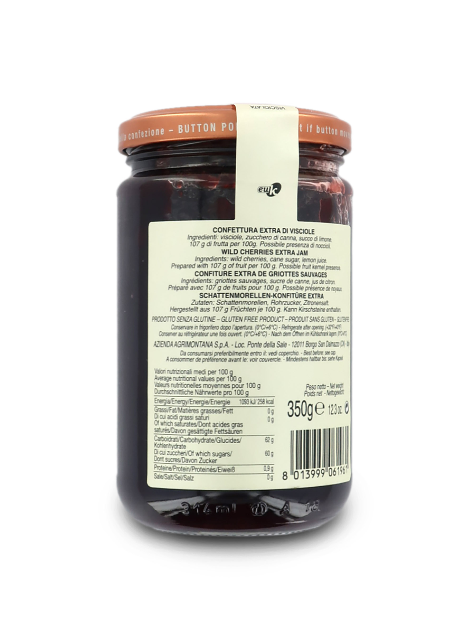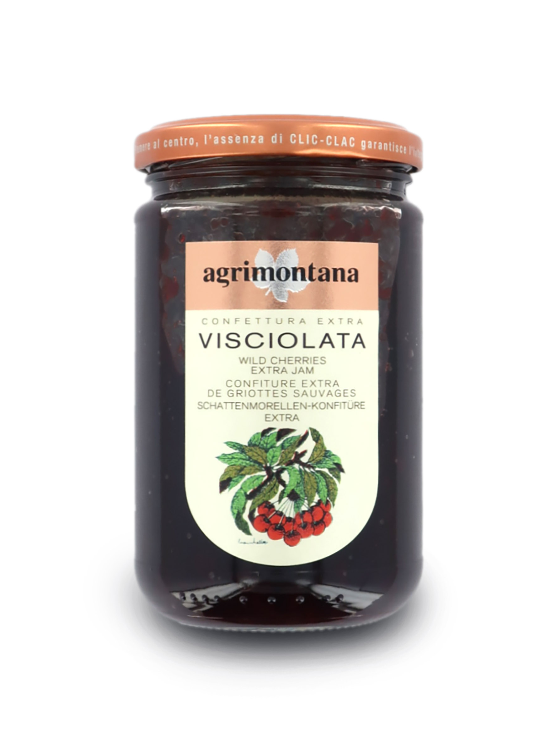 Confettura extra di ciliegia "visciola" in vasetto da 350 grammi. Per la sua realizzazione s'impiegano soltanto visciole italiane di prima qualità, che vantano una dolcezza maggiore rispetto alle classiche ciliegie.