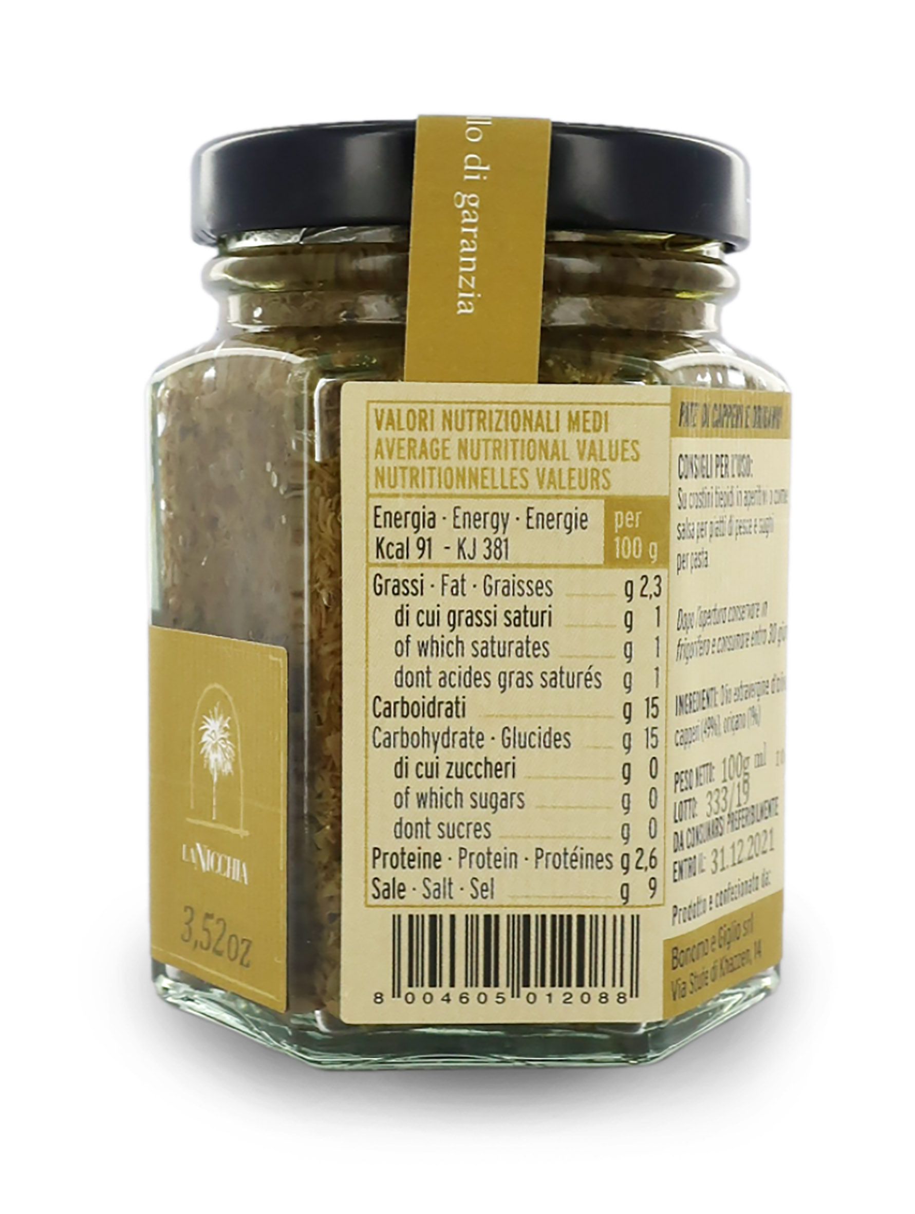Ingredienti: olio extravergine di oliva, 49% capperi (sale), 1% origano.