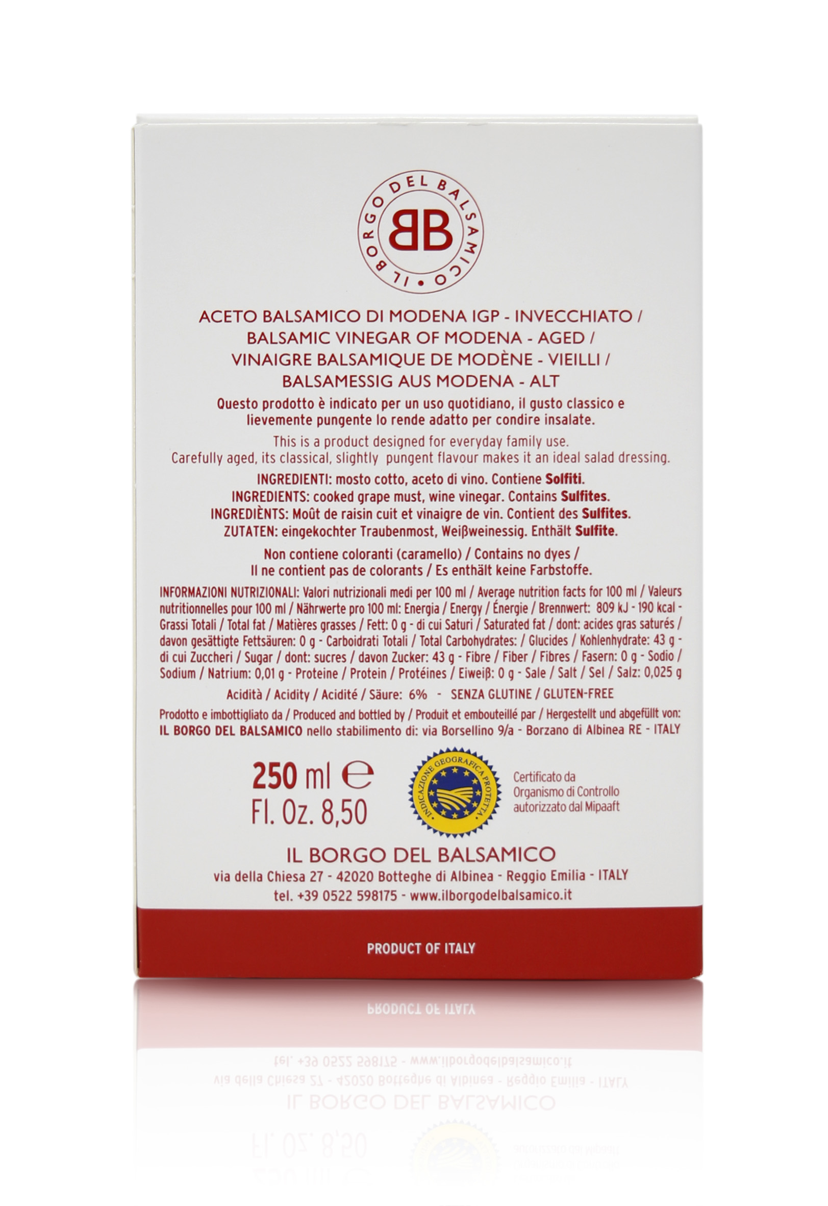 Prodotto e confezionato da "Il Borgo del Balsamico" in provincia di Reggio Emilia, Italia.
