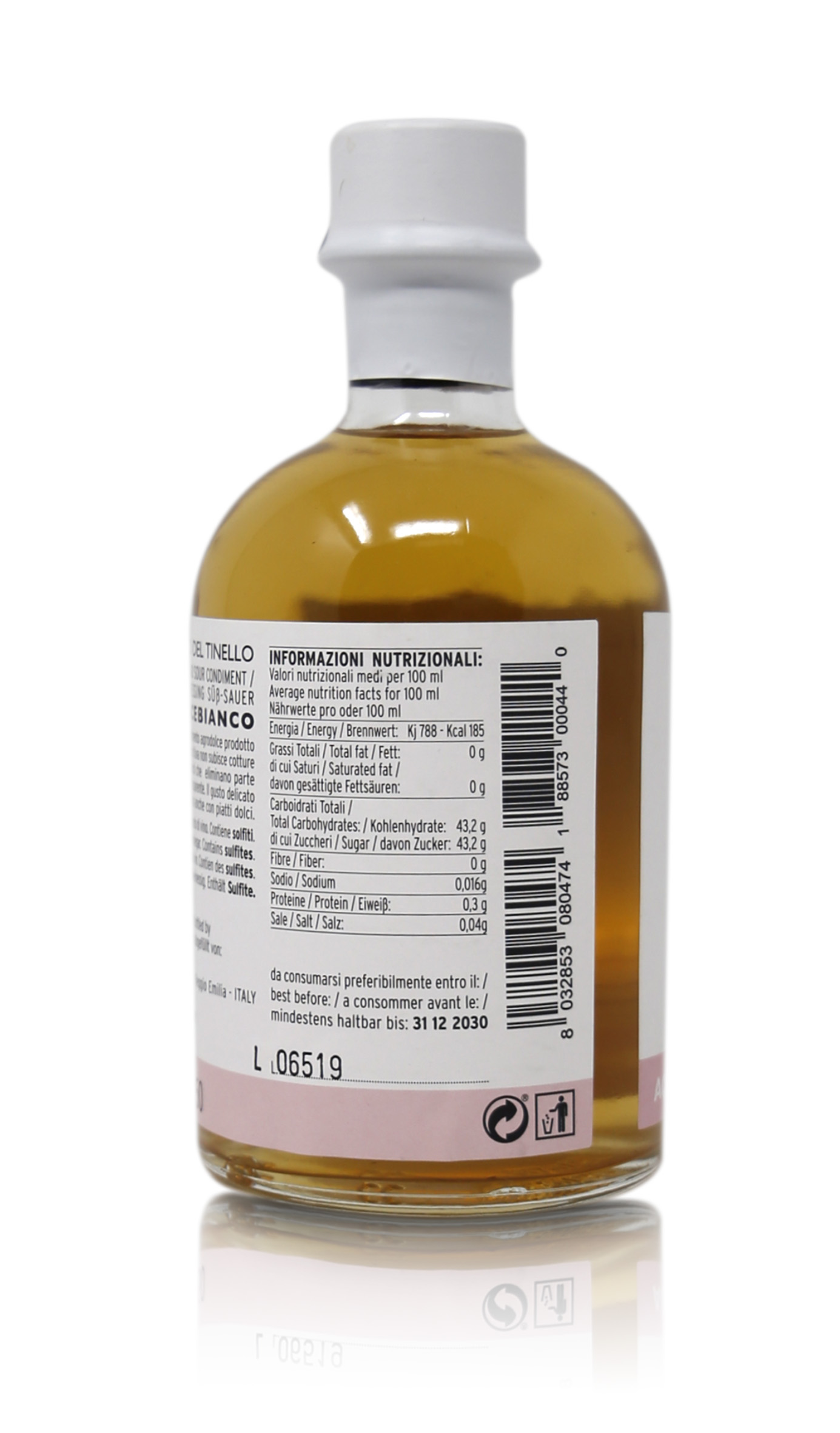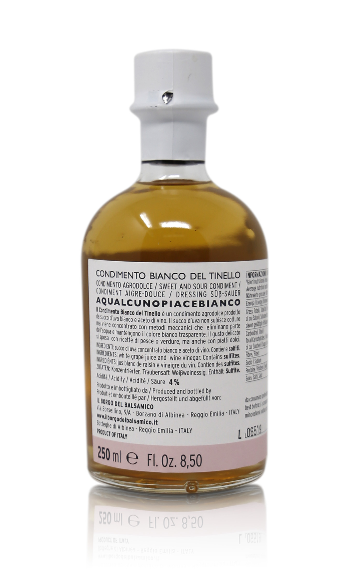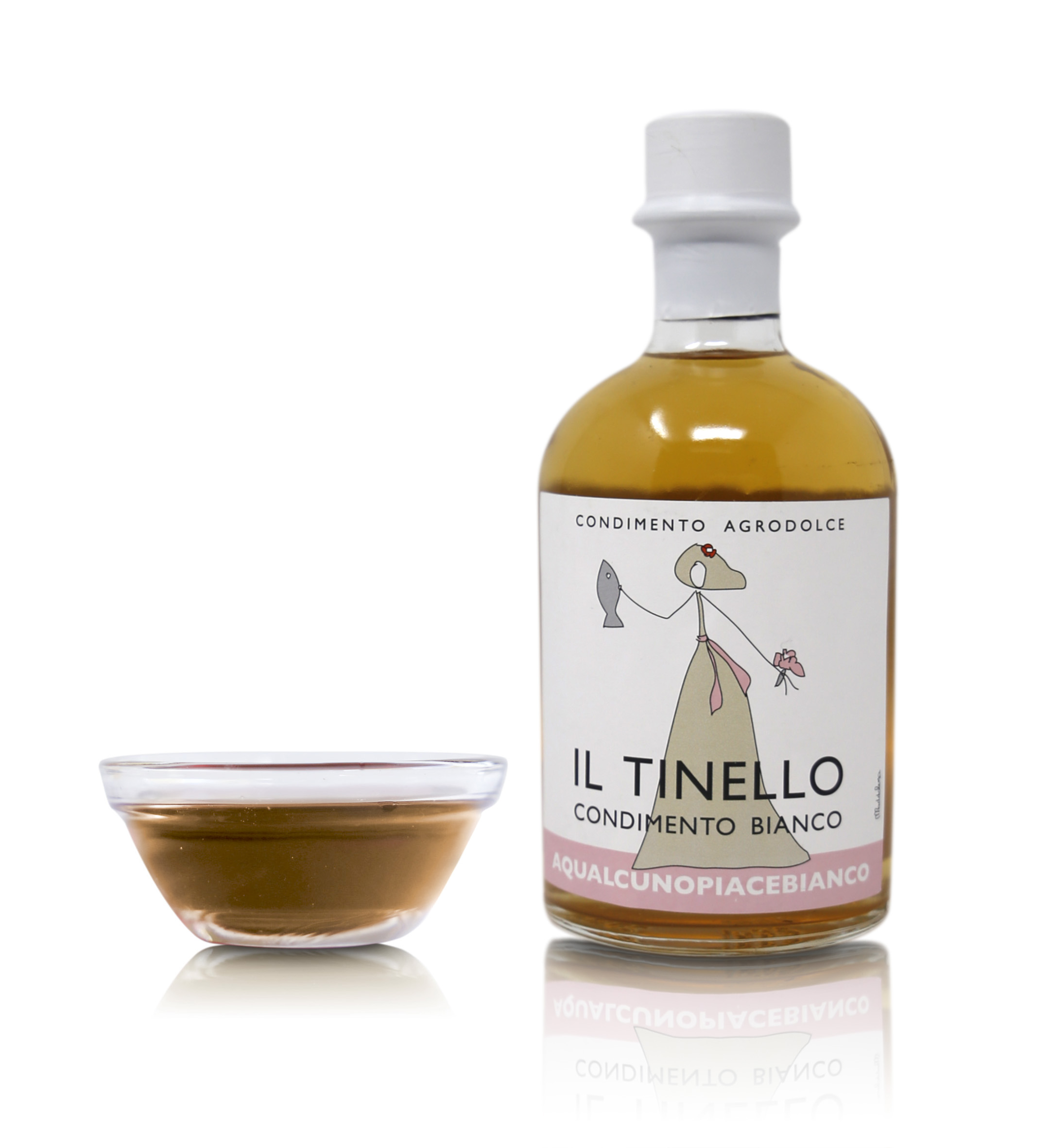Condimento "AQUALCUNOPIACEBIANCO". Il Condimento Bianco del Tinello è un Condimento Agrodolce prodotto da succo d'uva bianco e aceto di vino. Il succo d'uva non subisce cotture, ma viene concentrato con metodi meccanici che eliminano in parte l'acqua e mantengono il colore bianco trasparente. Il gusto delicato si abbina perfettamente con ricette di pesce o verdure, ma anche con piatti dolci.