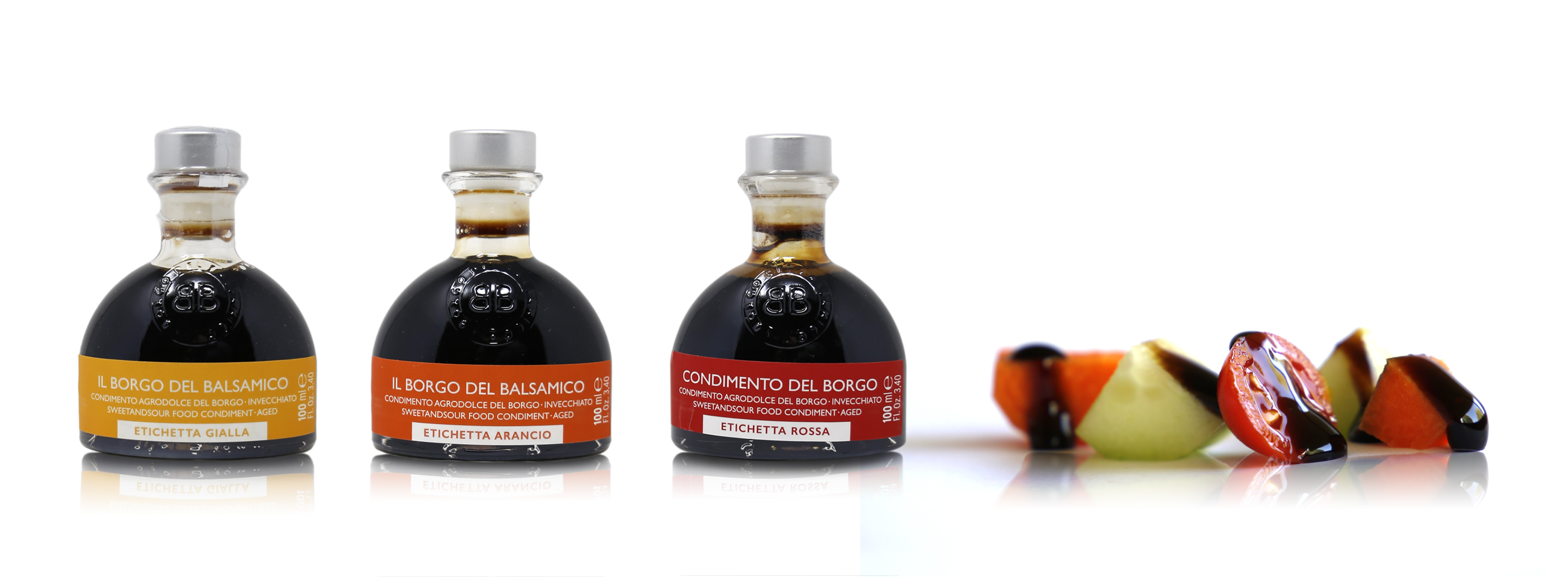 Etichetta rossa - È il condimento più pregiato della produzione de "Il Borgo del Balsamico". Aromatico e ricco di sensazioni, è indicato per ricette a crudo, sulla frutta, sul gelato o con i formaggi. Da non sottoporre a cotture.