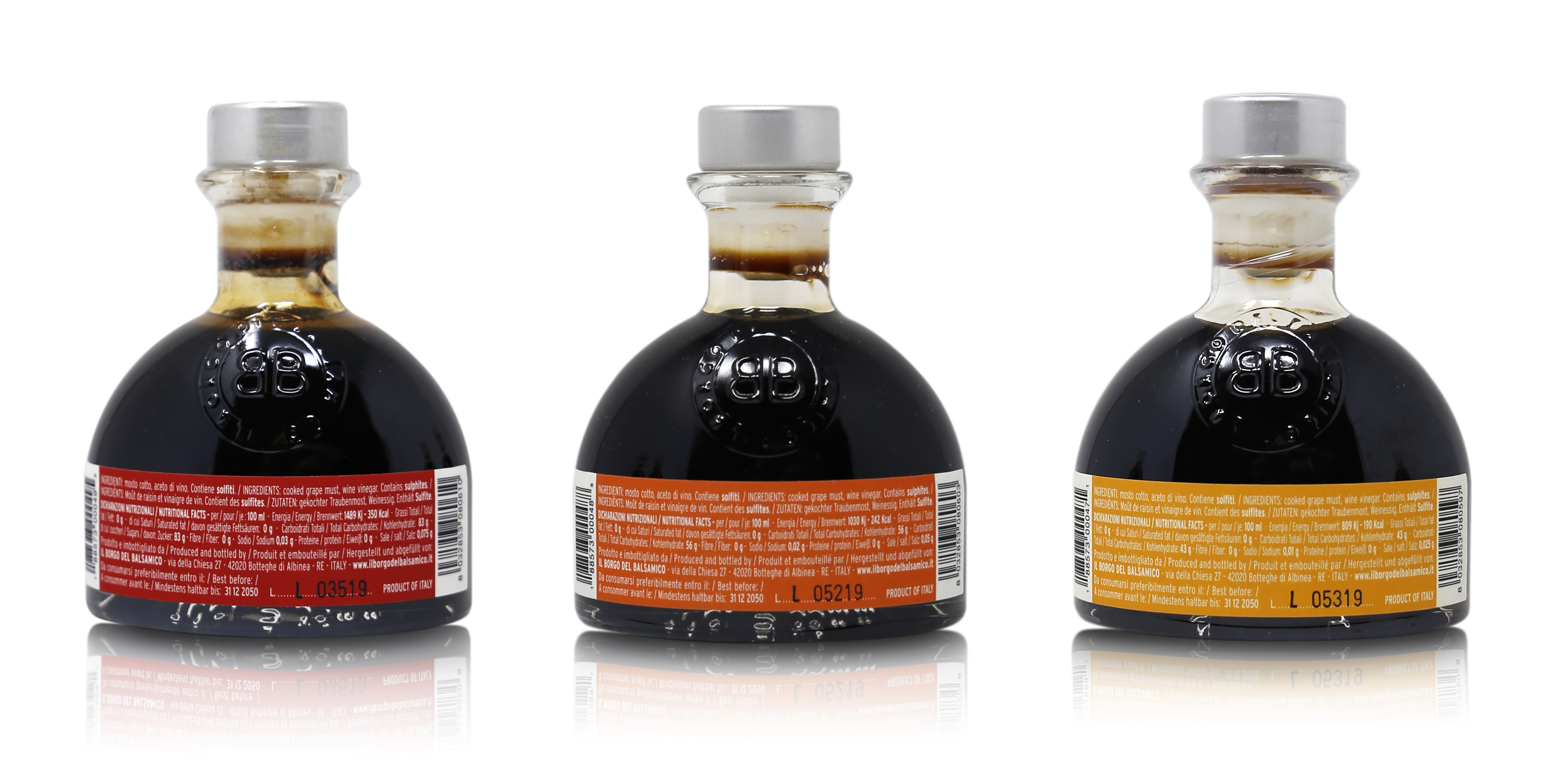 Tutti i tre condimenti sono realizzati da mosto d’uva acetificato e concentrato per evaporazione. Uve provenienti dalla provincia di Reggio Emilia.