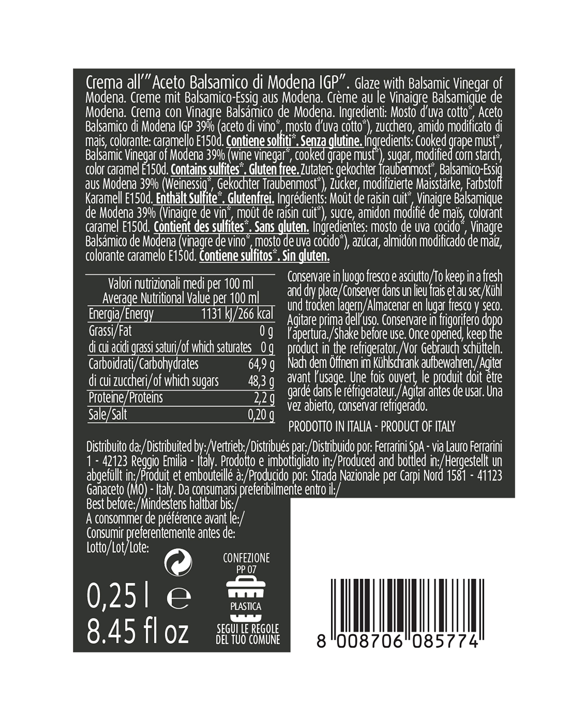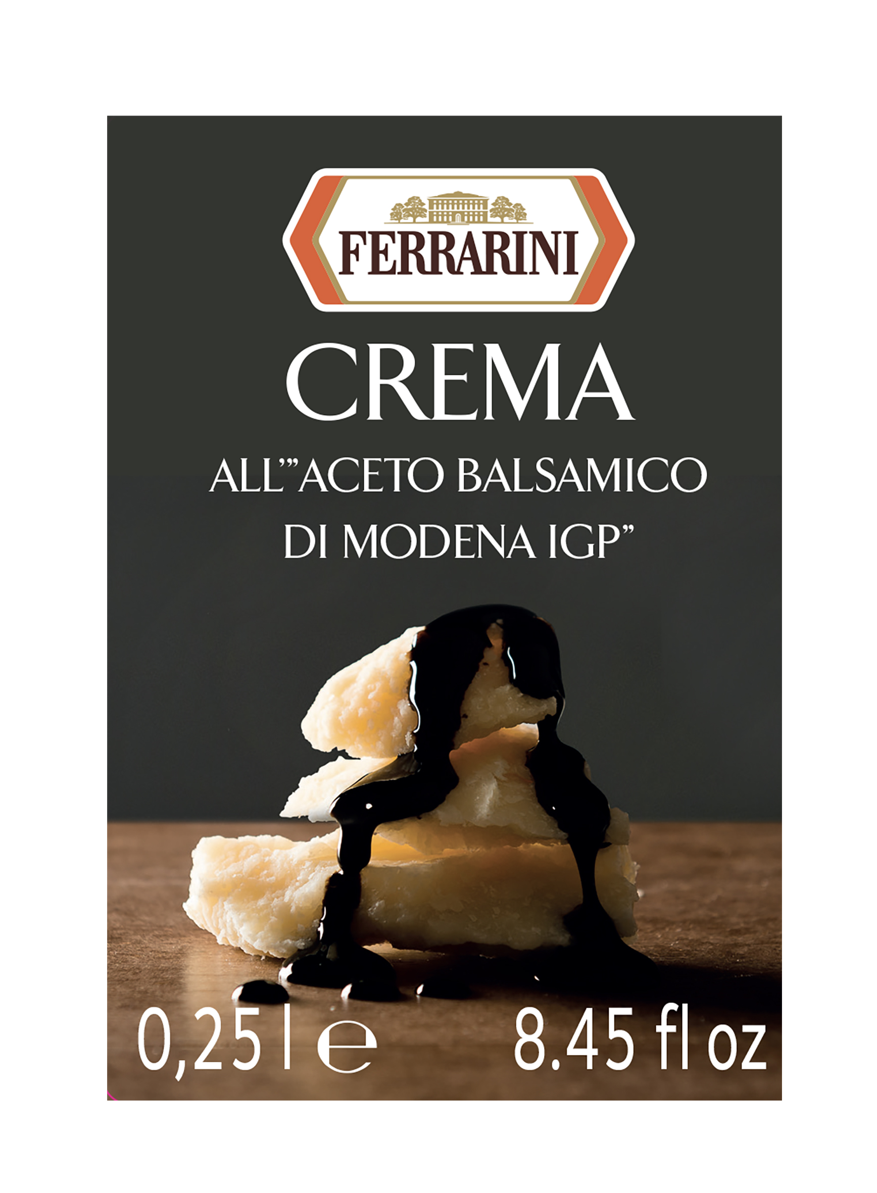 Dalla passione e dalla consolidata esperienza di Ferrarini, nasce la Crema di Aceto Balsamico di Modena IGP, bilanciata in modo estremamente delicato nel sapore agro-dolce. La sua pregiata consistenza deriva dalla miscelazione del mosto con l’aceto balsamico, a cui segue un processo speciale di filtrazione. Innovativa e versatile, la Crema di Aceto Balsamico di Modena IGP permette, grazie alla sua viscosità, di esprimere appieno l’estro creativo di ogni chef, con raffinate decorazioni che completeranno golosi dessert.