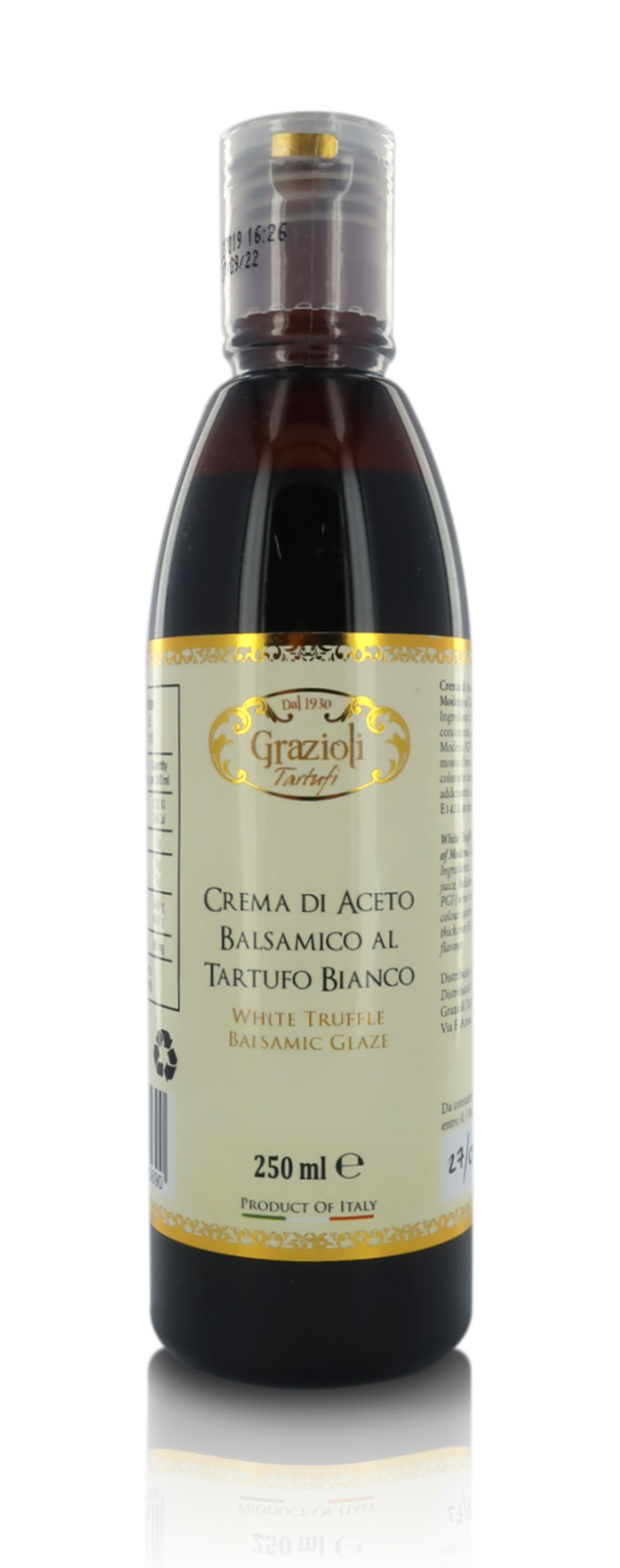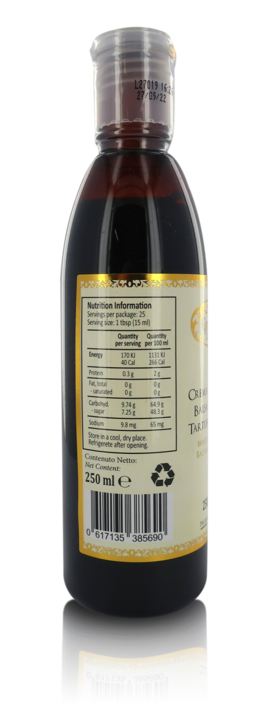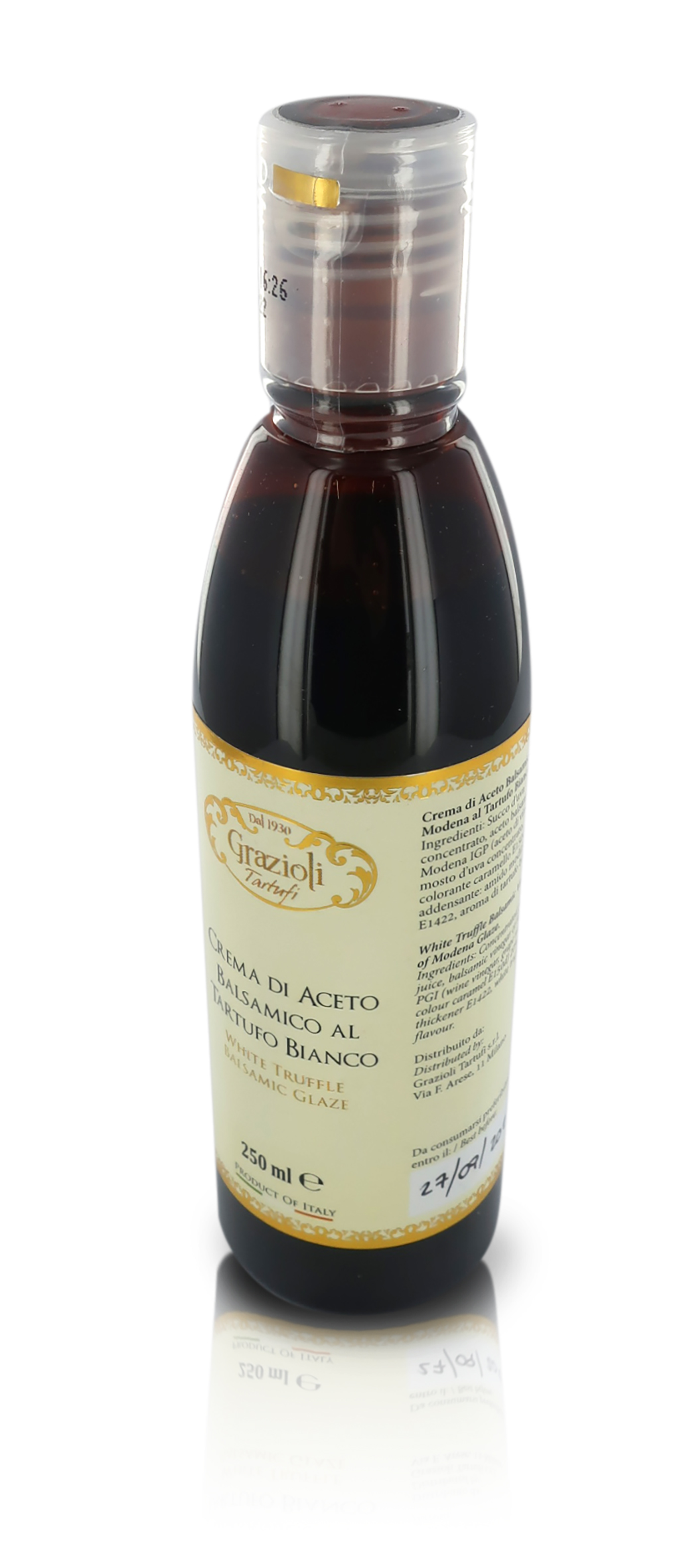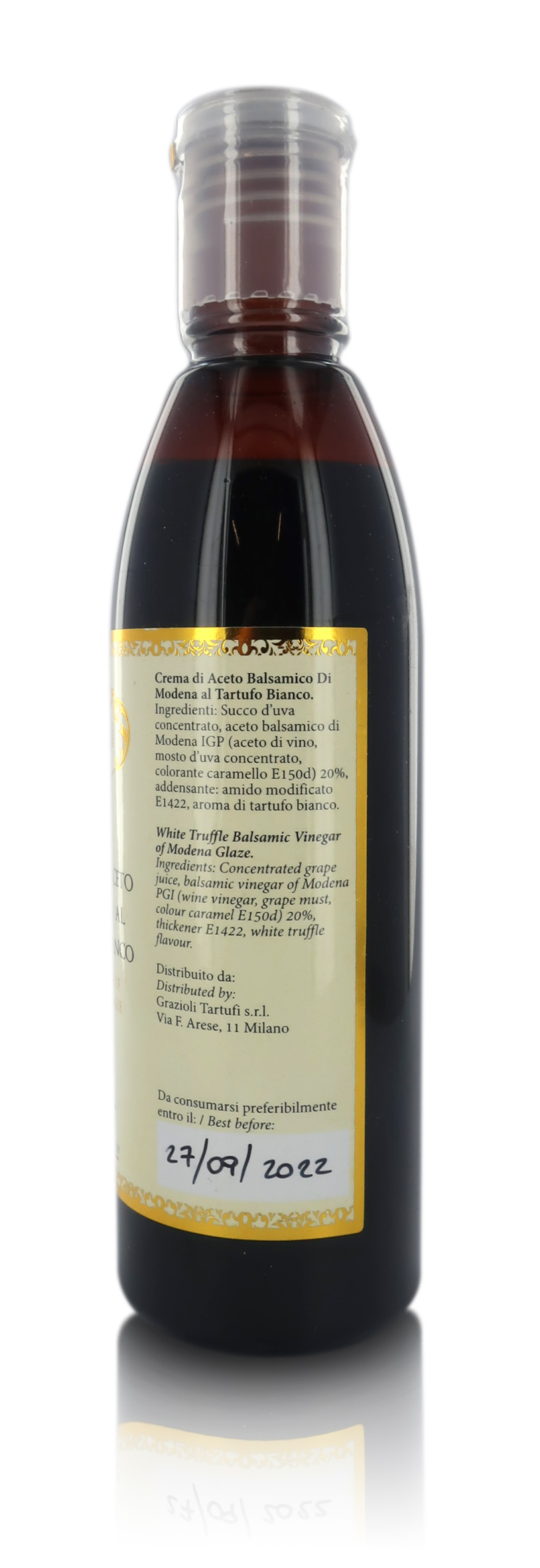 Ingredienti: succo d'uva concentrato, aceto balsamico di Modena IGP (aceto di vino, mosto d'uva concentrato, colorante caramello E150d 20%, addensante: amido modificato E1422, aroma di tartufo bianco.