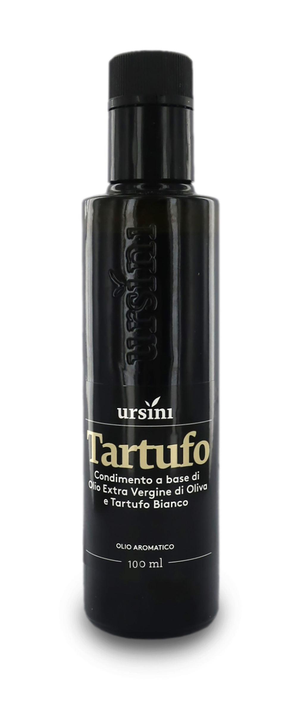 Olio extra vergine di oliva aromatizzato al tartufo bianco. L'olio, dal deciso aroma del tartufo bianco, è pensato per essere usato a crudo ed è particolarmente adatto per pasta in bianco, condimenti con funghi, formaggi freschi e stagionati, bruschette, focacce e pizza. In bottiglietta dallo stile moderno da 100ml.