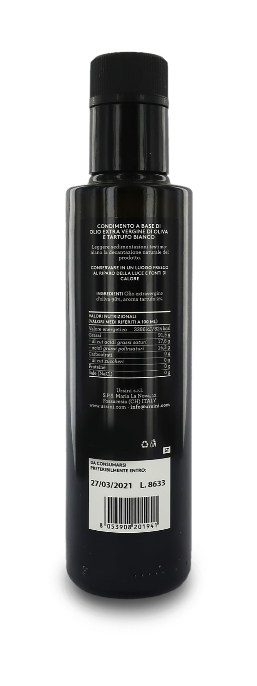 Ingredienti: olio extra vergine di oliva 98%, estratto naturale di tartufo bianco.