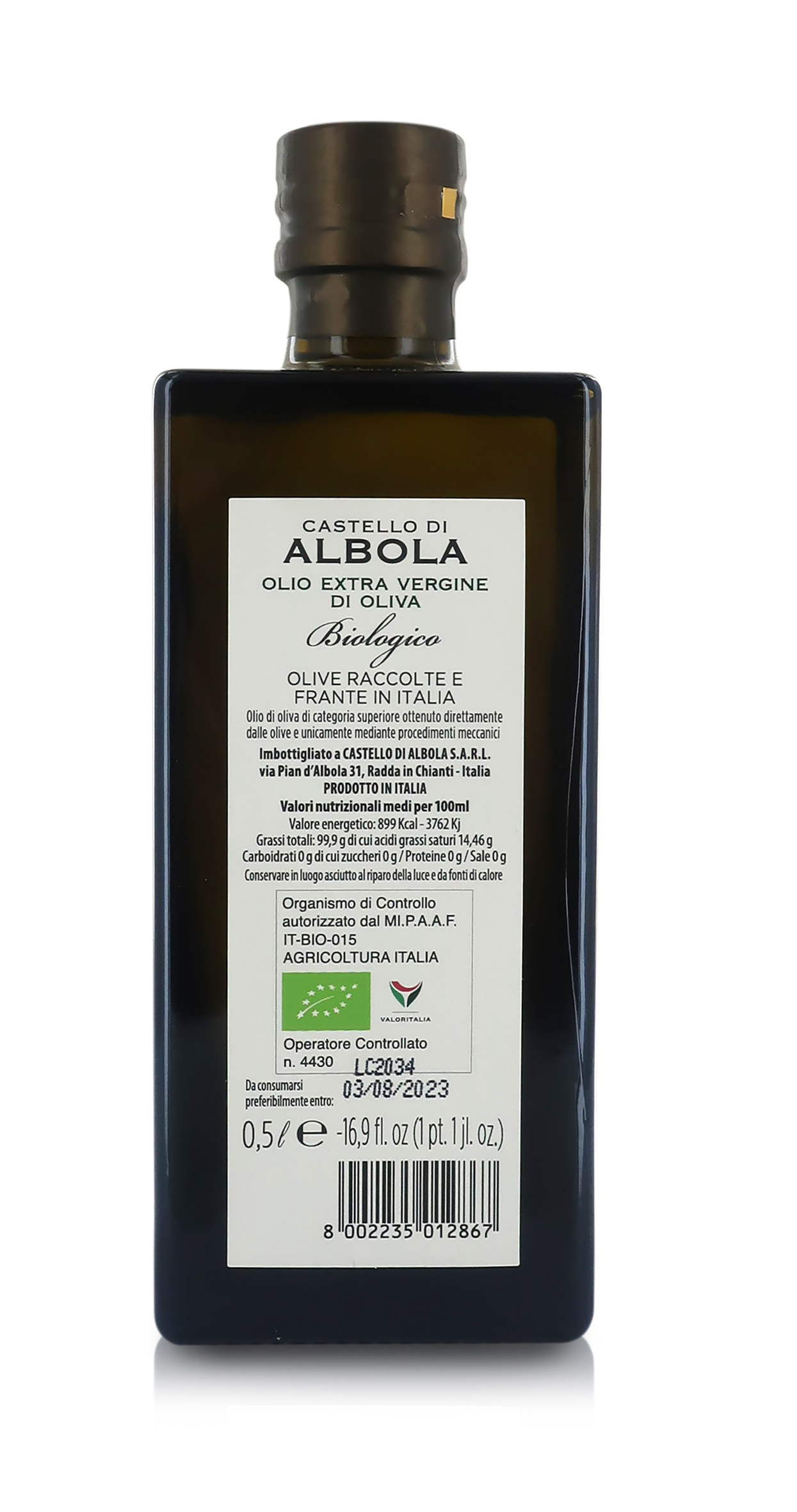 Olio extravergine di oliva italiano certificato biologico, di categoria superiore, ottenuto da olive raccolte e frante in Italia, di varietà Frantoio, Moraiolo e Leccino, mediante procedimenti meccanici.
