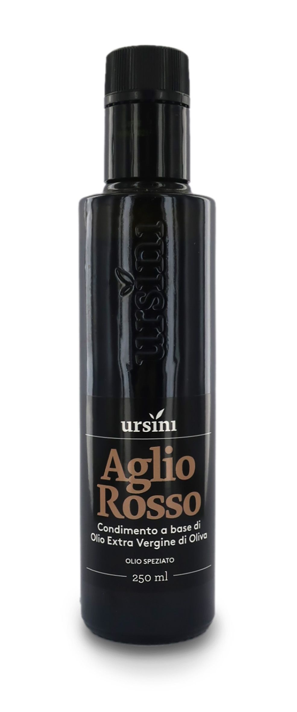 Olio extra vergine di oliva aromatizzato all'aglio rosso. L'olio ricco del delicato aroma dell'aglio rosso è pensato per essere usato a crudo ed è particolarmente adatto per condire bolliti, carni crude, bruschette e salse rustiche. In bottiglietta dallo stile moderno da 250ml.