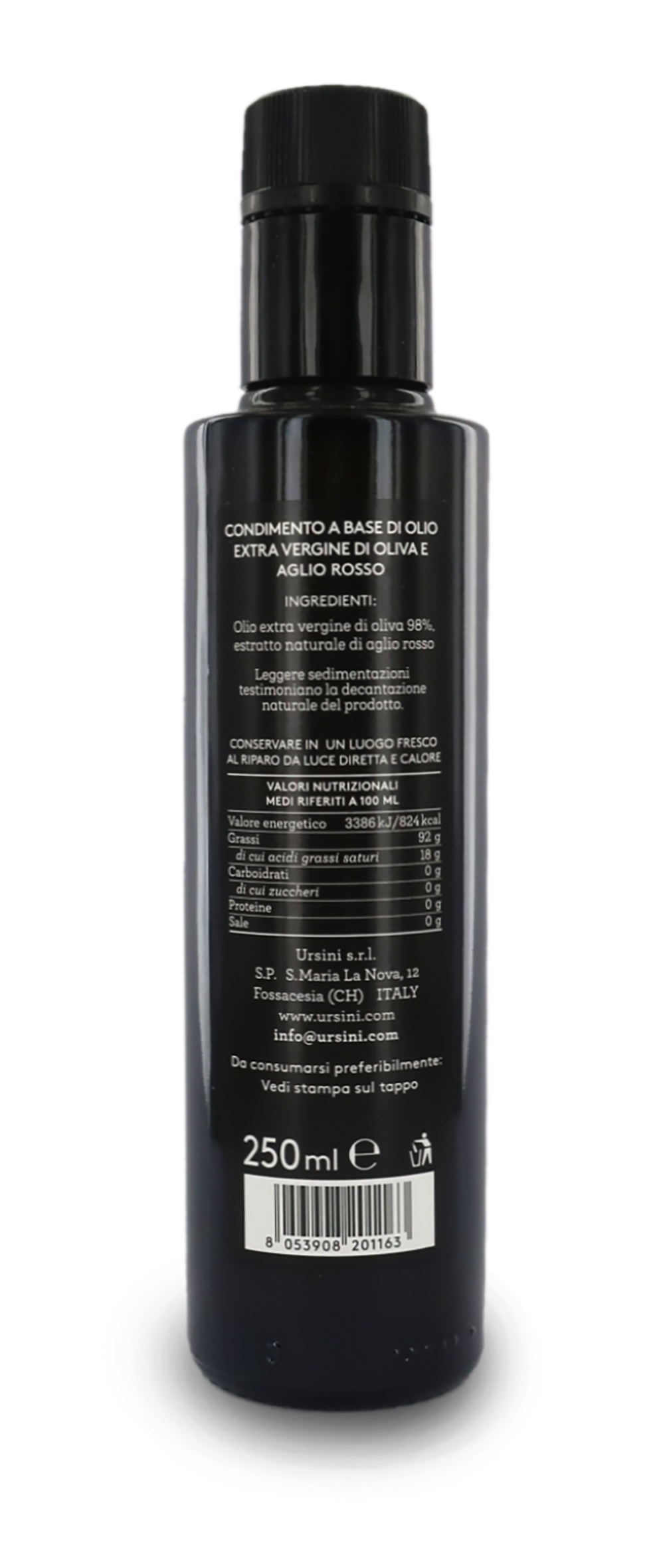 Ingredienti: olio extra vergine di oliva 98%, estratto naturale di aglio rosso.