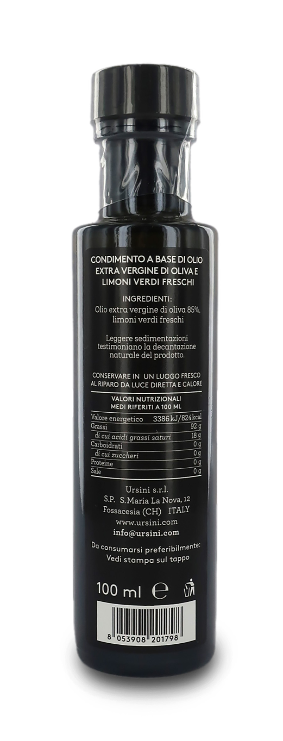Ingredienti: olio extra vergine di oliva 85%, limoni verdi freschi. Conservare in luogo fresco al riparo da luce diretta e calore.