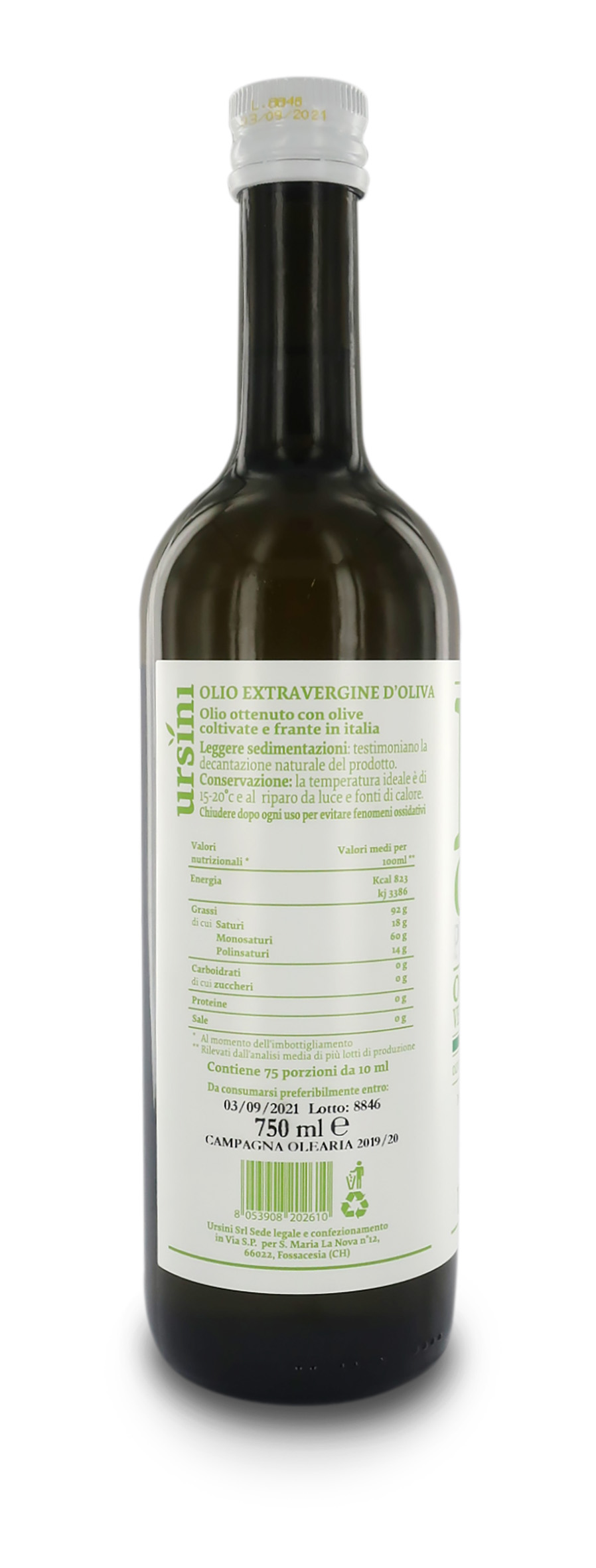 Olio ottenuto con olive coltivate e frante in Italia. Conservare in luogo fresco al riparo da luce diretta e calore.