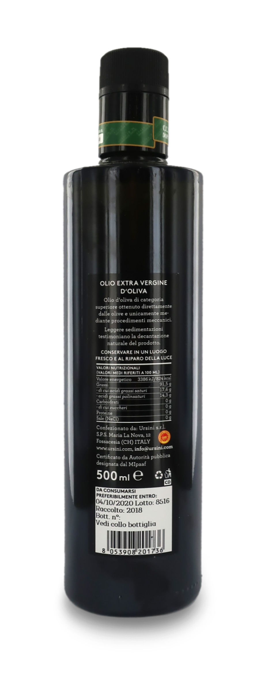 Olio ottenuto con olive coltivate e frante in Italia. Conservare in luogo fresco al riparo da luce diretta e calore.
