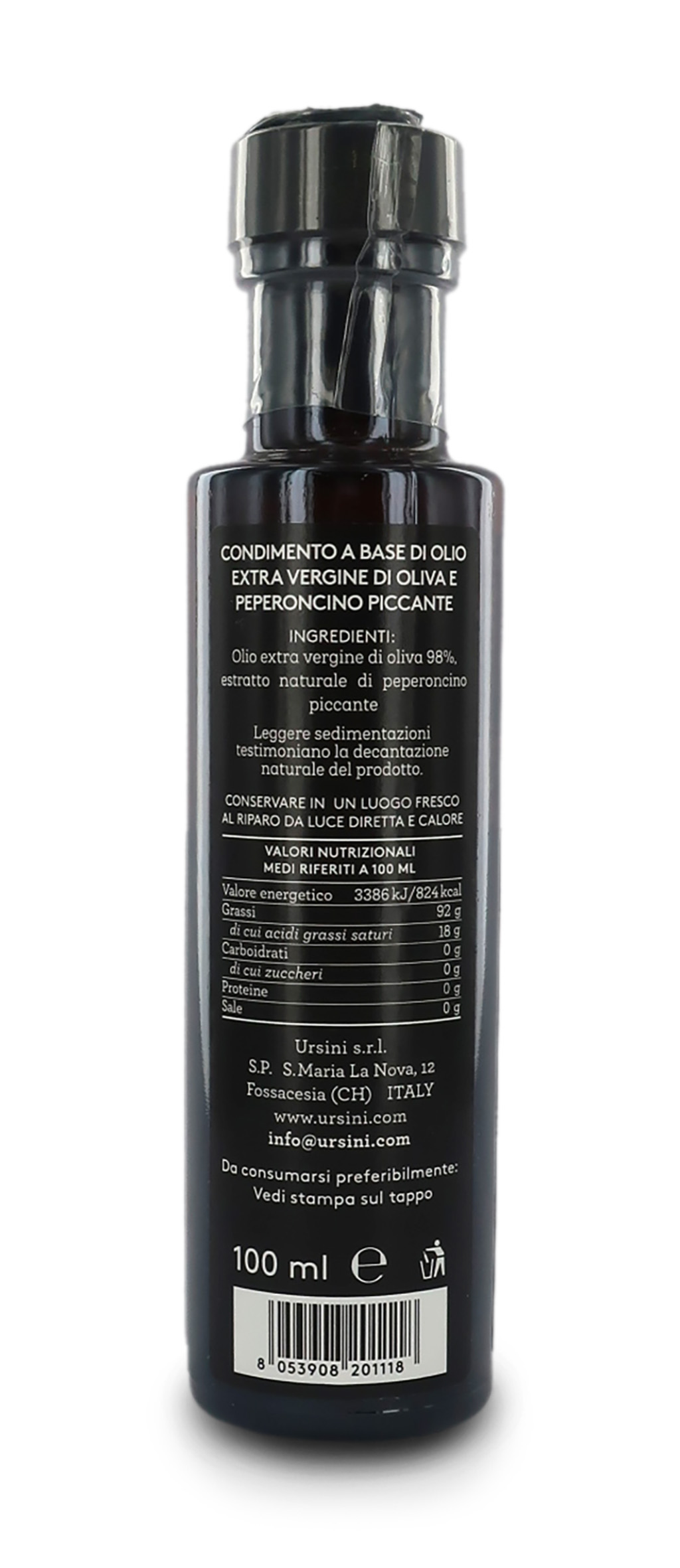 Ingredienti: olio extra vergine di oliva 98%, estratto naturale di peperoncino piccante.