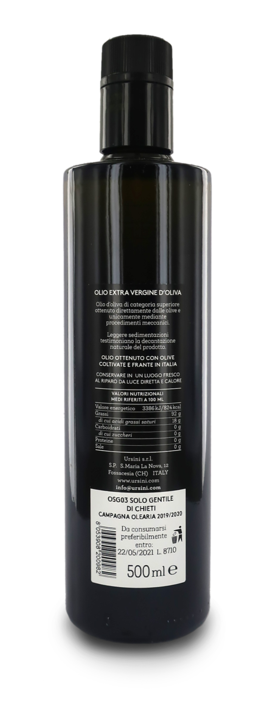 500 ml di olio extravergine di oliva monovarietale, 100% italiano, di categoria superiore, che vanta sentori di erba fresca. Al palato risulta armonico, caratterizzato da una spiccata delicatezza e una leggera aromaticità. Ottenuto direttamente dalle olive della varietà "Gentile di Chieti", unicamente mediante procedimenti meccanici. Il gusto è mediamente fruttato. Lo si consiglia con formaggi freschi (ricotta, mozzarella e cacio primo fiore), insalate, tartare di carne o pesce, carni bianche grigliate e verdure delicate.