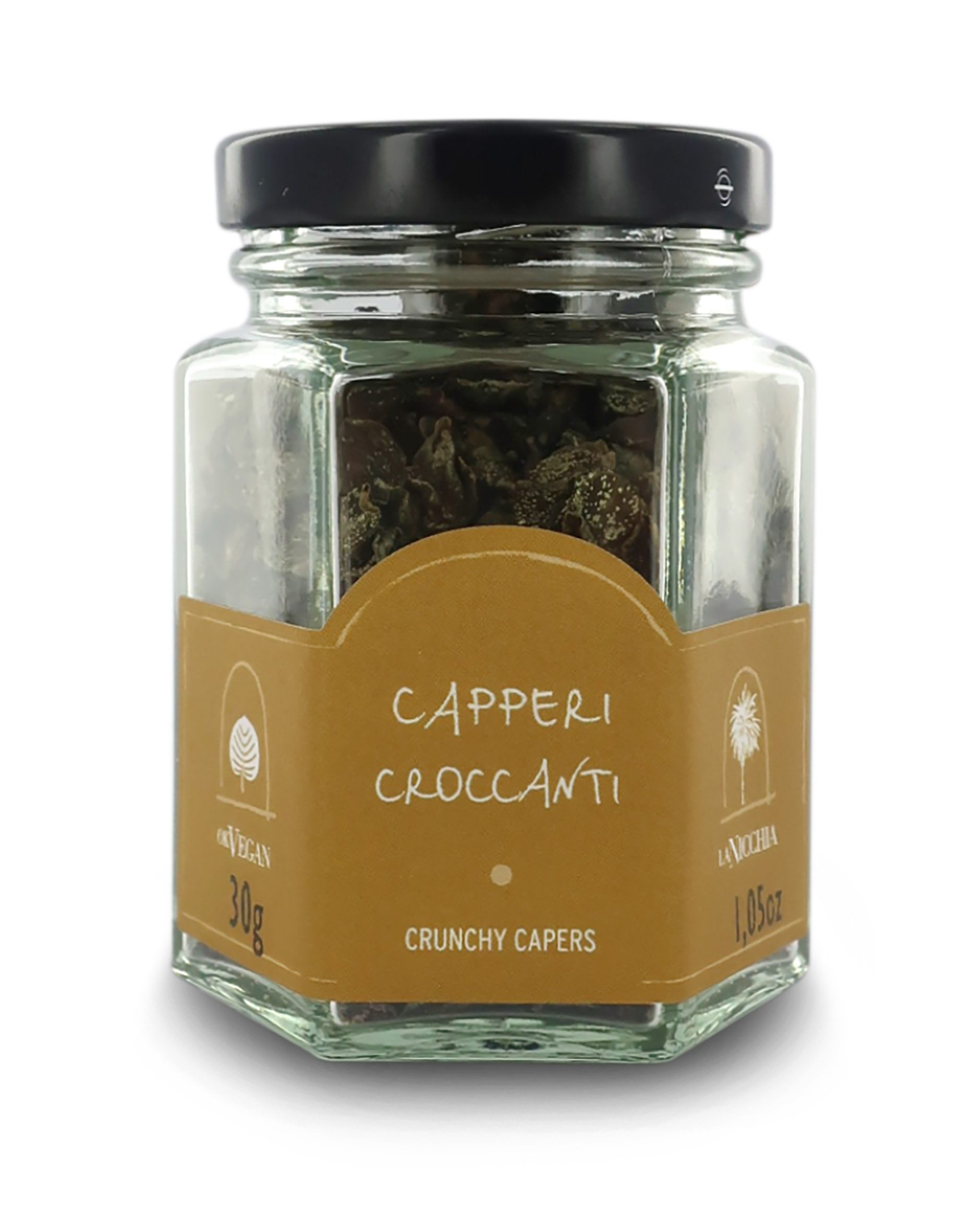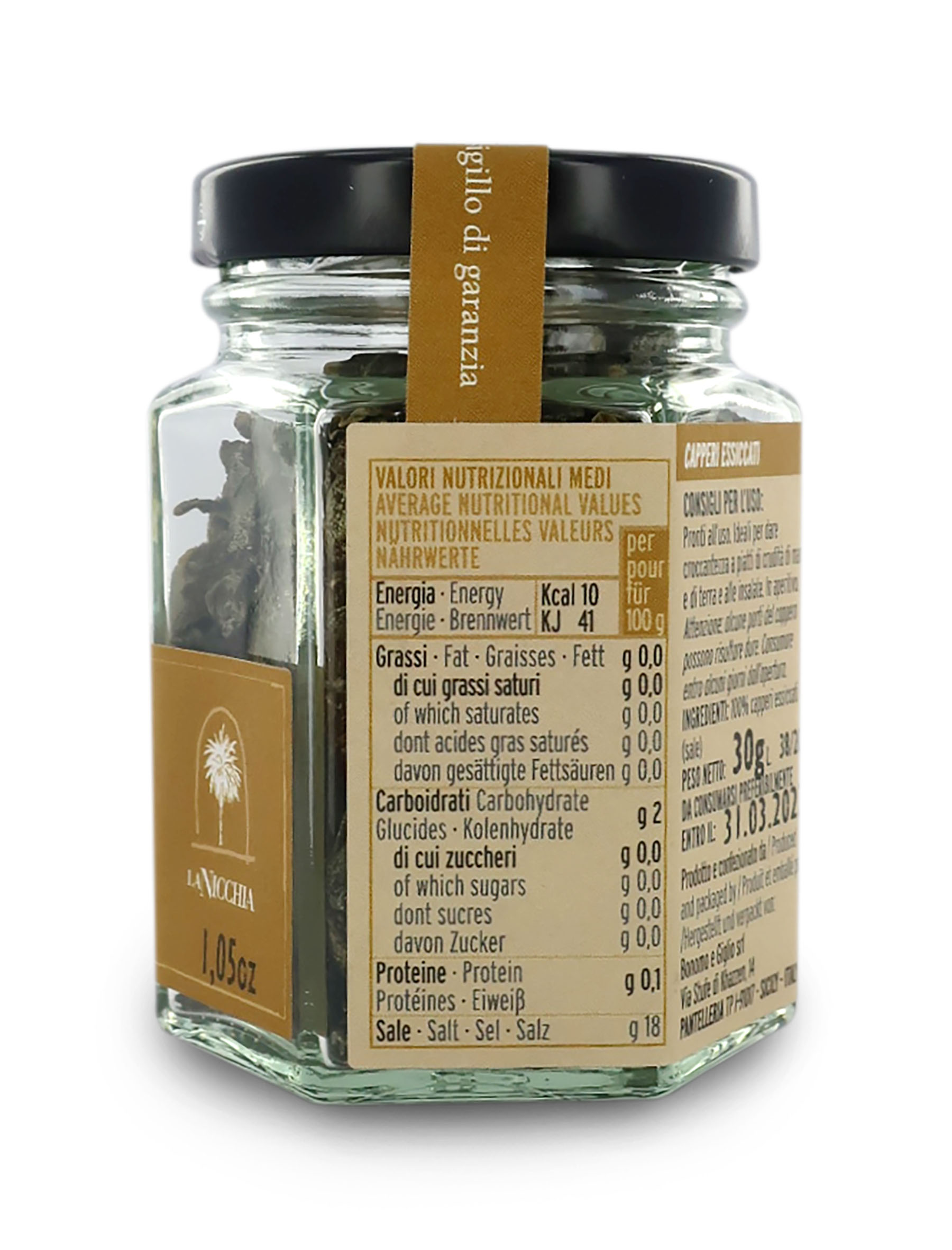 Rivisitazione del cappero a opera de La Nicchia, che propone il celeberrimo simbolo pantesco essiccato, in una forma tanto inusuale quanto sfiziosa. Vengono rigorosamente selezionati capperi del medesimo calibro, in modo da ottenere un prodotto omogeneo e uniforme. I capperi vengono dissalati ed essiccati, prima al sole e poi in disidratatore, per diventare l'ingrediente naturale perfetto che dona ai vostri piatti una nota croccante molto particolare. Perfetti anche da sgranocchiare durante un aperitivo, o come guarnizione di piatti di pesce, carne o pasta.